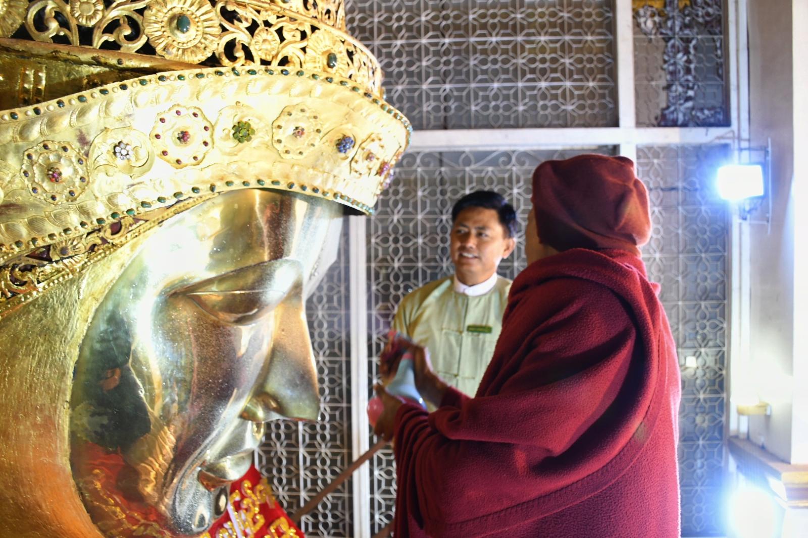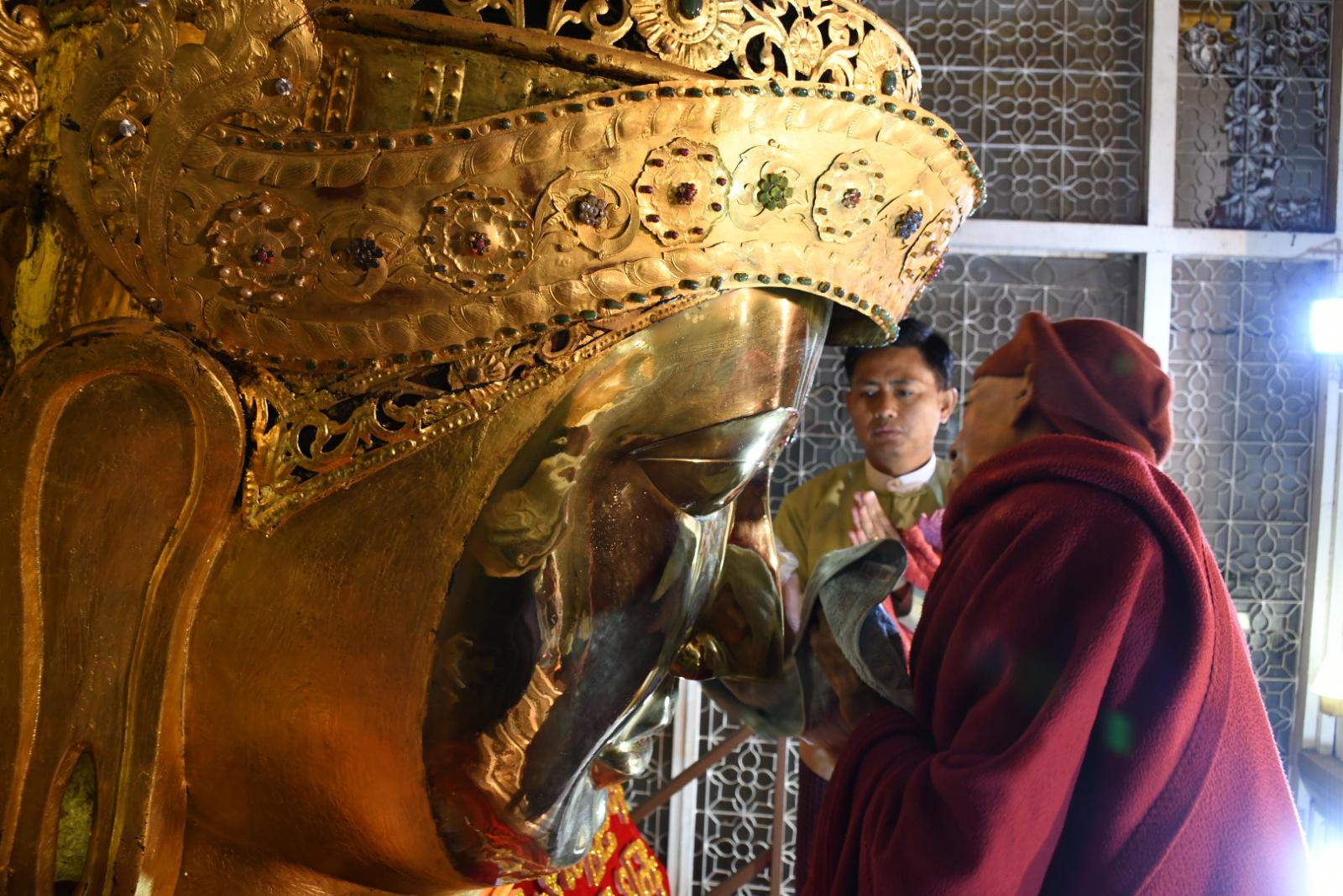 ရှေ့ဦးစွာ တက်ရောက်လာကြသည့် ဆရာတော်သံဃာတော်အရှင်သူမြတ်များ၊ ခရိုင်စီမံခန့်ခွဲရေးနှင့် အုပ်ချုပ်ရေးကော်မတီဥက္ကဌ ဦးမျိုးမင်းထွန်းနှင့် တာဝန်ရှိသူများက မဟာမြတ်မုနိရုပ်ရှင်တော်မြတ်ကြီး မျက်နှာတော်သစ်ပူဇော်ခြင်းနှင့် ရွေကြာသင်္ကန်း ဆက်ကပ်လှူဒါန်းခဲ့ပြီး ဆီးမီး၊ ပန်း၊ ရေချမ်းနှင့် ဆွမ်း၊ သစ်သီးဆွမ်းများ ဆက်ကပ်လှူဒါန်းခဲ့သည်။
