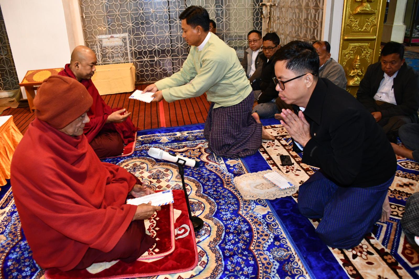 ဆက်လက်၍ ဆရာတော်သံဃာတော်အရှင်သူမြတ်များက ပရိတ်တရားတော်များ ရွတ်ဖတ်ပူဇော်ခဲ့ပြီး ခရိုင်စီမံခန့်ခွဲရေးနှင့် အုပ်ချုပ်ရေးကော်မတီဥက္ကဌ ဦးမျိုးမင်းထွန်းနှင့် တာဝန်ရှိသူများက ဆရာတော်သံဃာတော် အရှင်သူမြတ်တို့အား လှူဖွယ်ဝတ္ထုအစုစုအား ဆက်ကပ်လှူဒါန်းကာ လှူဒါန်းမှုအစုစုတို့အတွက် ရေစက်သွန်းချ အမျှပေးဝေခဲ့ကြောင်း သိရသည်။