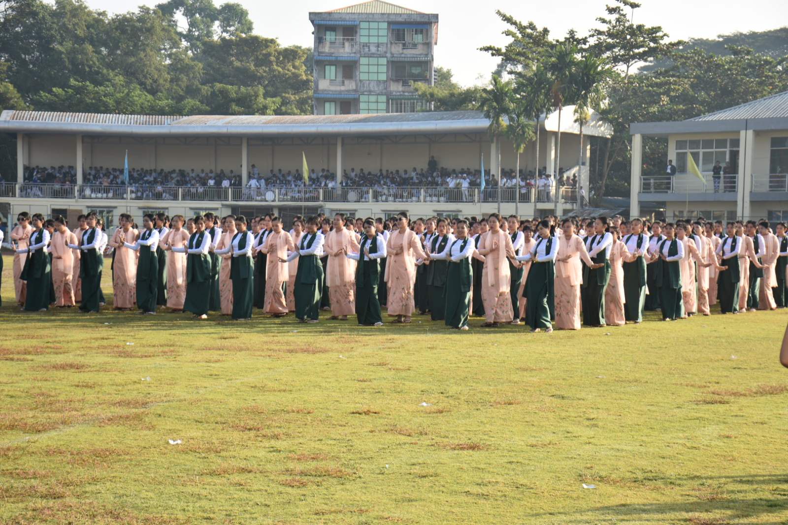 ဆက်လက်၍ စစ်ကြောင်းမှူးဦးဆောင်ကာ ဘင်ခရာအဖွဲ့၊ ပန်းပွားအကအဖွဲ့၊ ကဗျာလွတ်အကအဖွဲ့၊ ကာယအဖွဲ့၊ Fitness Exercises အဖွဲ့နှင့် တေးသရုပ်ဖော်အဖွဲ့များက ကွင်းအတွင်းမှ ပြန်လည်ထွက်ခွာပြီးနောက် တိုင်းဒေသကြီးဝန်ကြီးချုပ်နှင့် ဧည့်သည်တော်များသည် ပုသိမ်မြို့ပေါ်ရှိ အခြေခံပညာကျောင်းများမှ ကျောင်းသူ (၂၀၀)ဦးက အခြေခံကဗျာလွတ်အကဖြင့် ကပြဖျော်ဖြေမှု၊ အ.ထ.က(၂) ပုသိမ်မှ ကျောင်းသား၊ ကျောင်းသူ (၃ဝဝ)ဦးက ကာယပညာ အတွဲ(၃)ဖြင့် သရုပ်ပြသမှု၊ စိန့်ဂျွန်းကိုယ်ပိုင်အထက်တန်းကျောင်းမှ ကျောင်းသား/သူ (၂၀၀)ဦးက "အာရှမြန်မာ"သီချင်းဖြင့် PE-22 Fitness Exercises ကို သရုပ်ပြဖျော်ဖြေမှု၊ AD Myanmar မှကျောင်းသား/သူ (၁၀၀)ဦး၊ ပုသိမ်မြို့နယ်မှ မိဘ၊ ဆရာ/မ (၂ဝဝ)ဦးတို့က "စုံညီပွဲတော်တို့နွှဲပျော်" သီချင်းဖြင့် သရုပ်ဖော် ကပြဖျော်ဖြေမှုများကို ကြည့်ရှုအားပေးခဲ့ကြောင်း သိရသည်။