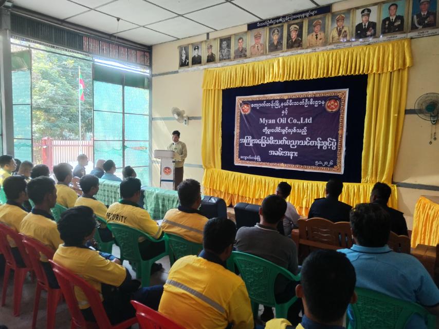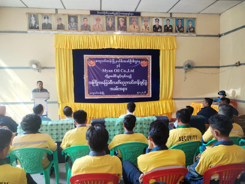 ထို့နောက် Myan Oil ကုမ္ပဏီ၏ တာဝန်ခံ ဦးမင်းသူကျော်မှ ယခုကဲ့သို့ အကြိုအခြေခံမီးသတ်ပညာသင်တန်းဖွင့်၍ မီးသတ်ပညာစာတွေ့လက်တွေ့များ သင်ကြားပေးသည့်အတွက် ကျေးဇူးတင်စကားပြောကြားခဲ့သည်၊