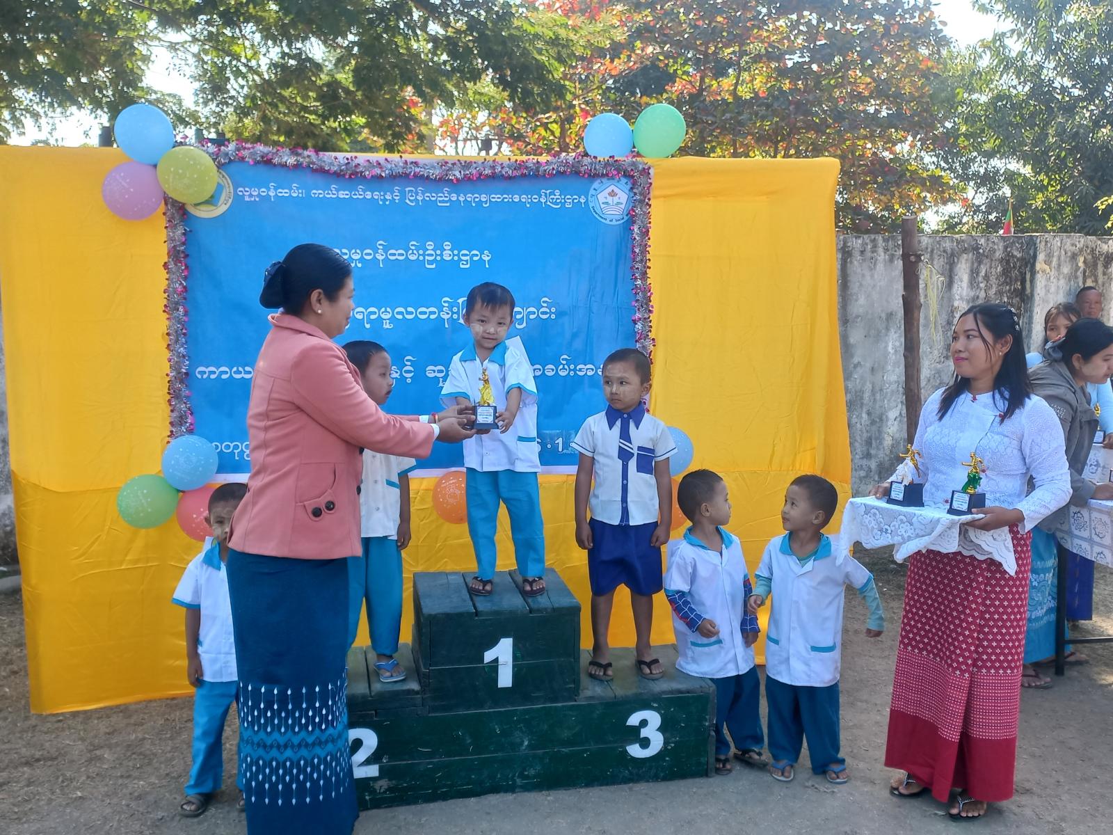 အဆိုပါအခမ်းအနားတွင် ပညာရေးမှုးရုံးဆရာကြီး ဦးအောင်မြင်ဌေး၊ ပြန်ကြားရေးနှင့်ပြည်သူ့ဆက်ဆံရေးဦးစီးဌာန၊ မူလတန်းကြိုကျောင်း ကျောင်းအုပ်ဆရာမနှင့်ဆရာမများကဆုရရှိသည့် သားငယ်၊ သမီးငယ်များအား ဆုများအသီးသီးချီးမြှင့်ခဲ့ပြီး အမှတ်တရစုပေါင်းမှတ်တမ်းတင်ဓာတ်ပုံရိုက်ကူးခဲ့ကြောင်း သိရသည်။