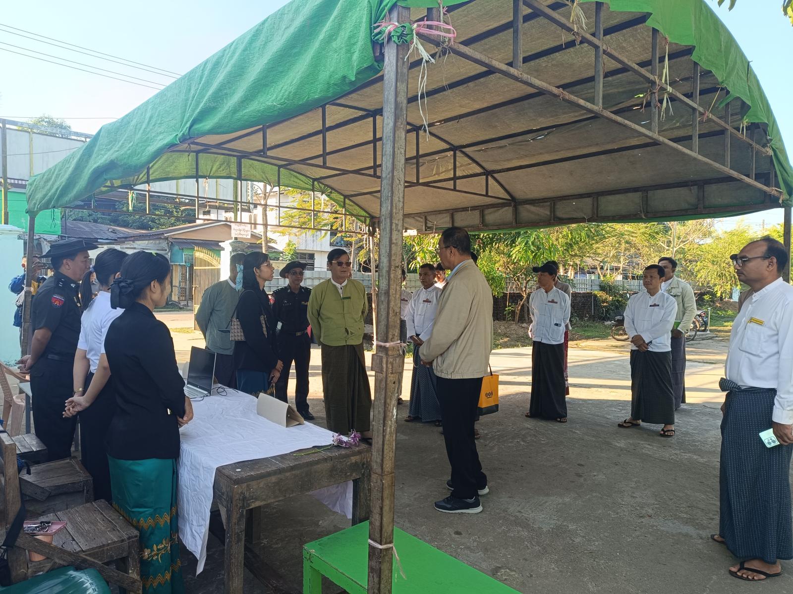 ရှေးဦးစွာ ပြည်ထောင်စုရွေးကောက်ပွဲကော်မရှင်အဖွဲ့ဝင် ပဲခူးတိုင်းဒေသကြီးတာဝန်ခံ ဦးအောင်မြင့်လွင်၊ တိုင်းဒေသကြီးရွေးကောက်ပွဲကော်မရှင်အဖွဲ့ခွဲဥက္ကဋ္ဌနှင့် အဖွဲ့ဝင်များ၊ ခရိုင်ရွေးကောက်ပွဲကော်မရှင်အဖွဲ့ခွဲဥက္ကဋ္ဌနှင့် အဖွဲ့ဝင်များ၊ ခရိုင်၊ မြို့နယ်စီမံခန့်ခွဲရေးနှင့် အုပ်ချုပ်ရေးကော်မတီဥက္ကဋ္ဌနှင့် အဖွဲ့ဝင်များ၊ မြို့နယ်ရွေးကောက်ပွဲကော်မရှင်အဖွဲ့ခွဲဥက္ကဋ္ဌနှင့် အဖွဲ့ဝင်များက တာဝန်ရှိသူများနှင့်အတူ အ.လ.က(ခွဲ)ဈေးပိုင်း မဲရုံ၊ အ.လ.ကခွဲ ဘုရားကြီးပိုင်းမဲရုံ၊ စက်ကုန်းပိုင်းရပ်ကွက် အ.ထ.က တောင်ဘက်ကမ်းမဲရုံ၊ ဘူတာပိုင်းရပ်ကွက်နှင့် ဘုရားကြီးပိုင်းရပ်ကွက်အုပ်ချုပ်ရေးမှူးရုံးများ၌ ကြိုတင်မဲပုံးများ လုံခြုံရေးကြိုးများ တပ်ဆင်ထားရှိမှုနှင့် မဲပေးစက်များ၊ INSTALLATION နှင့် ဆက်စပ်ပစ္စည်းများ တပ်ဆင်ထားရှိမှုကို လိုက်လံကြည့်ရှုစစ်ဆေးပြီး လိုအပ်သည်များကို လမ်းညွှန်မှာကြားခဲ့ကြောင်း သိရသည်။