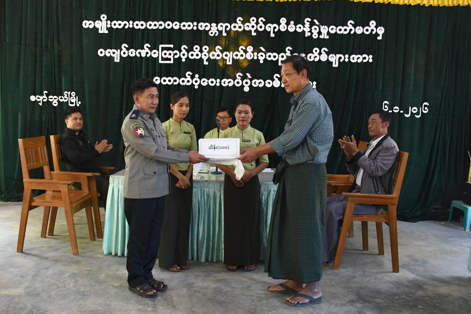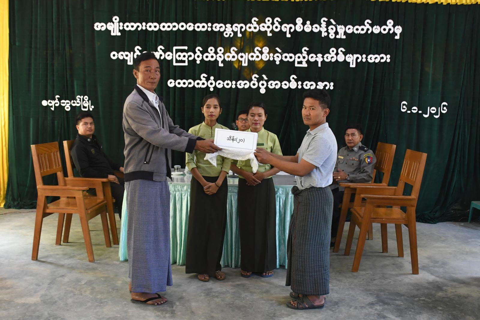 အမျိုးသားသဘာဝဘေးအန္တရာယ်ဆိုင်ရာ စီမံခန့်ခွဲမှုကော်မတီမှ ဝါးထရံအိမ် တစ်စိတ်တစ်ပိုင်းပျက်စီးမှုအတွက် ငွေကျပ် ၆ သိန်းကျော်၊ ဝါးထရံအိမ်အလုံးစုံ ပျက်စီးမှုအတွက် ငွေကျပ်သိန်း ၂၀၊ ပျဉ်ထောင်အိမ်တစ်ထပ် အလုံးစုံပျက်စီးမှုအတွက် ငွေကျပ်သိန်း ၁၀၀၊ စုစုပေါင်းနေအိမ် ၃ လုံးအတွက် ပေးအပ်ခဲ့ရာ မြို့နယ် စီမံခန့်ခွဲရေးနှင့်အုပ်ချုပ်ရေးကော်မတီဥက္ကဋ္ဌနှင့် အဖွဲ့ဝင်များက ထပ်ဆင့်ပေးအပ်ခဲ့ကြောင်း သိရသည်။
