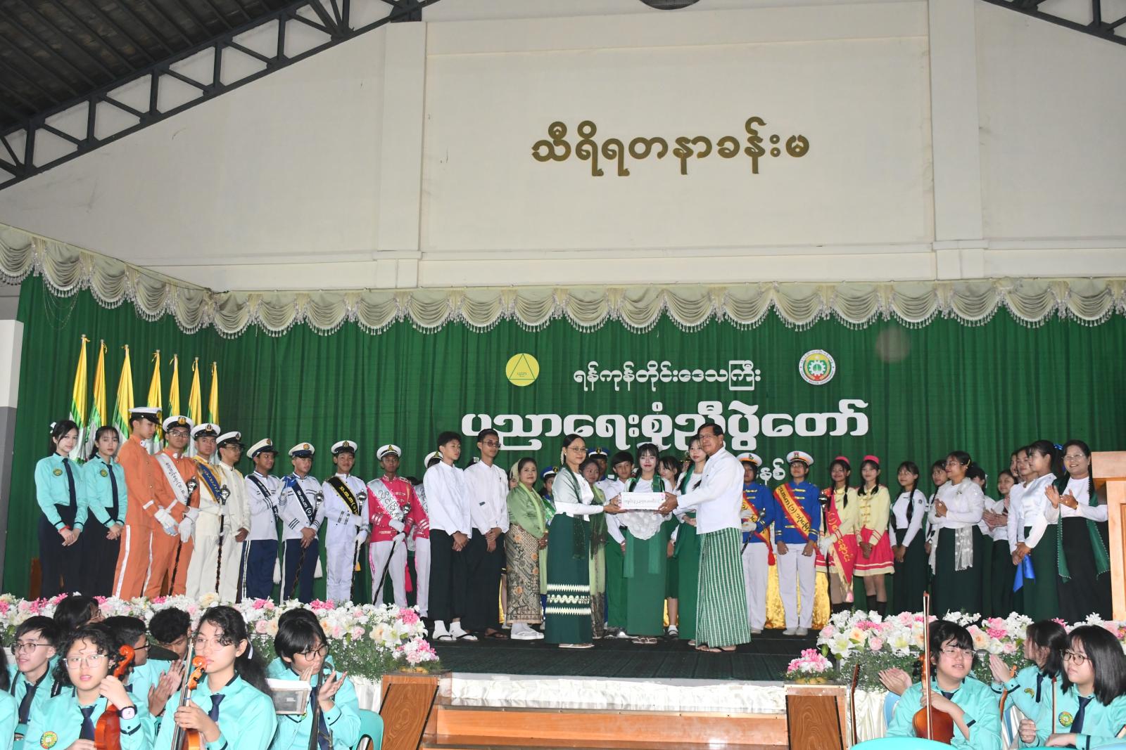 ယင်းနောက် ရန်ကုန်တိုင်းဒေသကြီး ဝန်ကြီးချုပ် ဦးစိုးသိန်းက ပညာရေးစုံညီပွဲတော် ကျင်းပရေးအတွက် ဂုဏ်ပြုချီးမြှင့်ငွေများကို ပေးအပ်ရာ ရန်ကုန်တိုင်းဒေသကြီး ပညာရေးမှူးရုံး၊ ဒုတိယညွှန်ကြားရေးမှူးချုပ် ဒေါက်တာ ချိုချိုမြတ်အောင်က လက်ခံရယူသည်။