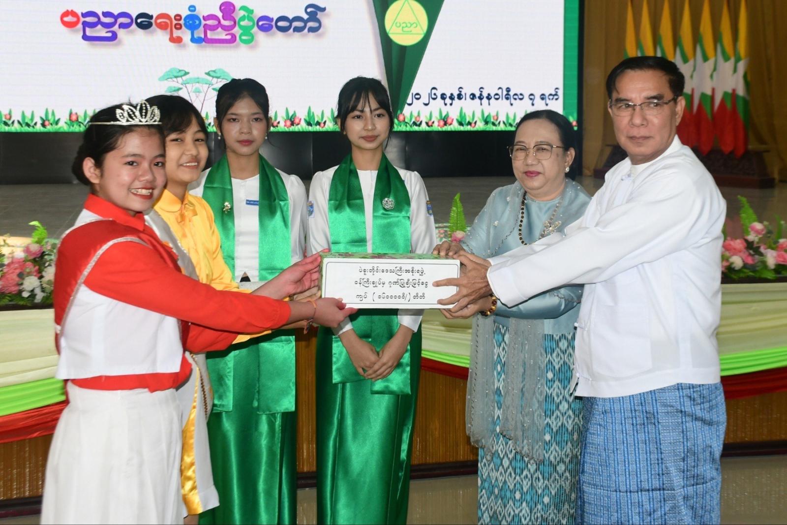 ယင်းနောက် ပဲခူးတိုင်းဒေသကြီးဝန်ကြီးချုပ် ဦးမျိုးဆွေဝင်းက နိုင်ငံတစ်ခုဒေသတစ်ခု ဖွံ့ဖြိုးတိုးတက်ဖို့ ပညာရေးကဏ္ဍသည် အလွန်အရေးကြီးပြီး ကျောင်းသား/သူများကို တီထွင်ဖန်တီးတတ်သူများ၊ တာဝန်ယူ/တာဝန်ခံတတ်သူများ၊ ပူးပေါင်းဆောင်ရွက်တတ်သူများ၊ ပြည်သူ့နီတိကို နားလည်ပြီး ဘဝတွင် ကြုံတွေ့လာနိုင်သည့် အခက်အခဲများကို ဖြေရှင်းနိုင်သော အရည်အသွေးပြည့်ဝသည့် လူချွန်လူကောင်းများဖြစ်စေရေး ဝိုင်းဝန်းပြုစု ပျိုးထောင်ပေးသွားရမှာဖြစ်ကြောင်း၊ ကျောင်းနေအရွယ်ကလေးတိုင်း အခမဲ့ပညာရေးစနစ်ဖြင့် ကျောင်းနေနိုင်ရေး ဆောင်ရွက်ပေးလျက်ရှိသလို အခက်အခဲအမျိုးမျိုးကြောင့် စာသင်ကျောင်းသို့ မလာရောက်နိုင်သည့် ကလေးများအတွက် ၂၀၂၄ - ၂၀၂၅ ခုနှစ်မှစ၍ ကျောင်းပြင်ပညာသင်ကြားရေးစနစ်ကို အကောင်အထည်ဖော်ပေးနိုင်ခဲ့ကြောင်း၊ မျက်မှောက်ခေတ်ကာလ၏ လူ့အဖွဲ့အစည်းကို ပညာကလွှမ်းမိုးသော ခေတ်ဖြစ်သည့်အတွက် ခေတ်မီဖွံ့ဖြိုးတိုးတက်သော နိုင်ငံတော်သစ်ကြီးတည်ဆောက်ရာတွင် ထူးချွန်ထက်မြက်သော လူ့စွမ်းအားအရင်းအမြစ်များဖြစ်သည့် လိုအပ်သဖြင့် ယခုလိုအခမ်းအနားကျင်းပ၍ ထူးချွန်ထက်မြက်သော ကျောင်းသား/သူများကို ချီးမြောက်ပေးရခြင်းဖြစ်ကြောင်းနှင့် အနာဂတ်နိုင်ငံတော်၏ ပညာရေးကဏ္ဍဖွံ့ဖြိုးတိုးတက်စေရေး၊ တက္ကသိုလ်ဝင်တန်း အောင်ချက်မြင့်မားစေရေး အားလုံးဝိုင်းဝန်းကြိုးစားဆောင်ရွက်သွားကြစေလိုကြောင်း ပြောကြားခဲ့သည်။