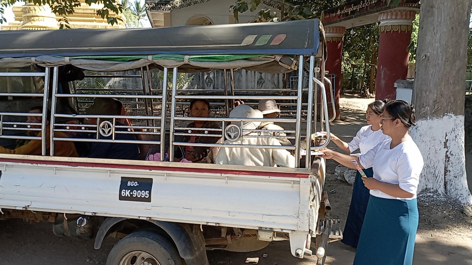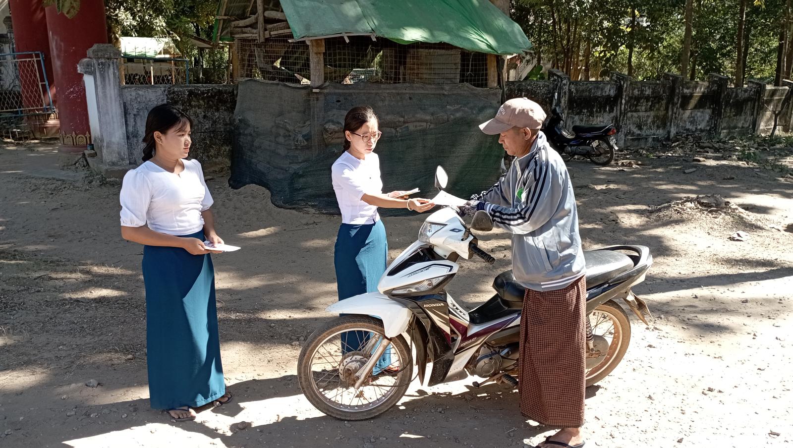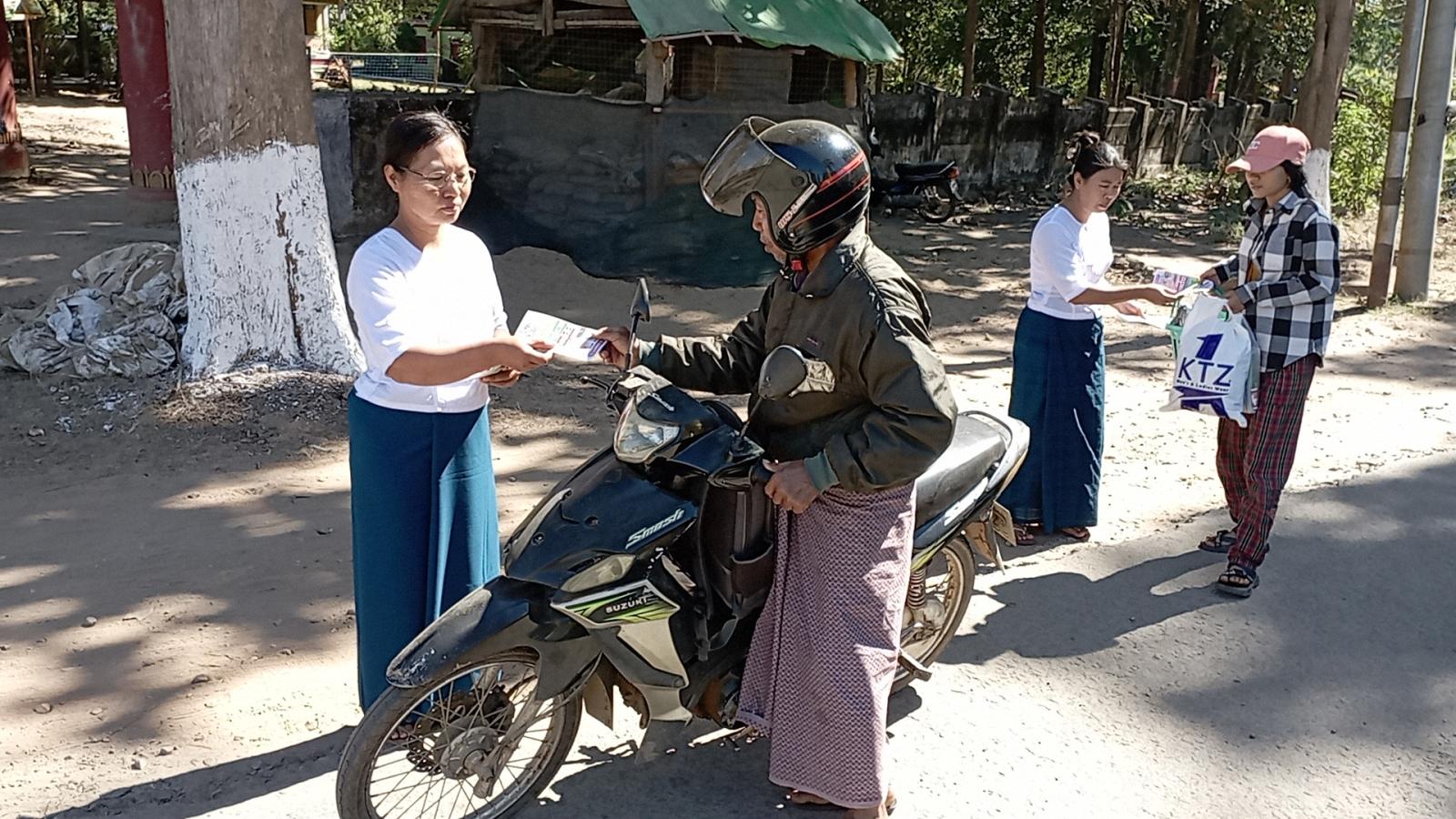 ထိုသို့ဆောင်ရွက်ရာတွင် မြို့နယ်ပြန်ကြားရေးနှင့်ပြည်သူ့ဆက်ဆံရေးဦးစီးဌာနမှ ဒုတိယဦးစီးမှူး ဒေါ်ပြည့်ဖြိုးသူနှင့် ဝန်ထမ်းများက ဒီမိုကရေစီကို ပြန်လည်ဖော်ဆောင်ဖို့အတွက် ရွေးကောက်ပွဲမှလွဲ၍ အခြားနည်းမရှိပါ၊ ပြည်သူများလိုလားသည့် ဒီမိုကရေစီနိုင်ငံတော်ကို ရွေးကောက်ပွဲဖြင့်သာ ဖော်ဆောင်နိုင်ပါသည်၊ ဒီမိုကရေစီခိုင်မြဲဖို့ မဲရုံသွားပြီး မဲပေးကြပါစို့၊ နိုင်ငံဖွံ့ဖြိုးတိုးတက်ဖို့ ဦးဆောင်နိုင်သူရွေးချယ်ကြပါစို့” စသည့်အကြောင်းအရာများ ပါဝင်သော လက်ကမ်းစာစောင်များအား ပြည်သူများနှင့် ကျောင်းသား/ကျောင်းသူများ၏ လက်ဝယ်အရောက် ဖြန့်ဝေပေးခဲ့ကြောင်း သိရသည်။