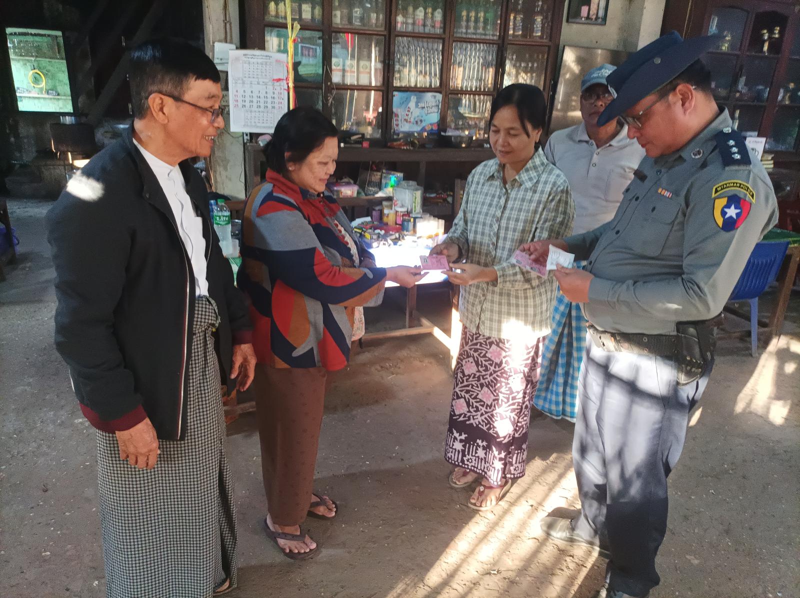 မကွေးတိုင်းဒေသကြီး၊ အောင်လံခရိုင်၊ ဆင်ပေါင်ဝဲ မြို့ပေါ်ရပ်ကွက်များရှိ မဲဆန္ဒရှင်ပြည်သူများအား မဲစလစ်များဖြန့်ဝေခြင်း၊ နိုင်ငံသားစိစစ်ရေးကတ်ပြားများတွင် မဲစာရင်းနံပါတ်များအား Price Tape ဖြင့် ရေးသားကပ်နှိပ်ခြင်းများ ဖြန့်ဝေထားရှိမှု ရှိ/ မရှိ စစ်ဆေးခြင်းကို ယမန်နေ့ နေ့လယ် ၃ နာရီအချိန်က တစ်အိမ်တက်ဆင်း ကွင်းဆင်းစစ်ဆေးခဲ့ကြသည်။