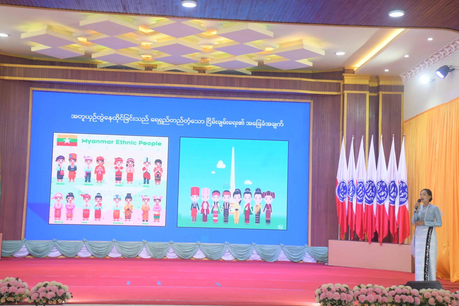 ဦးစွာ ရခိုင်ပြည်နယ်ဝန်ကြီးချုပ် ဦးထိန်လင်းနှင့် အခမ်းအနားသို့ တက်ရောက်လာကြသူများက နိုင်ငံတော်အလံအား အလေးပြုကြပြီး ရခိုင်ပြည်နယ်ကိုယ်စားပြု လူငယ်ကိုယ်စားလှယ်များက “လေးဝတီ” သီချင်းဖြင့် ကပြဖျော်ဖြေပေးကြသည်။