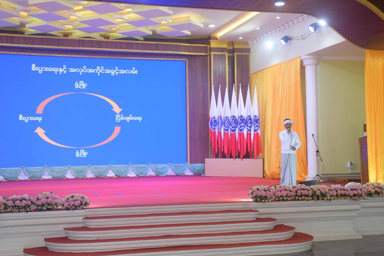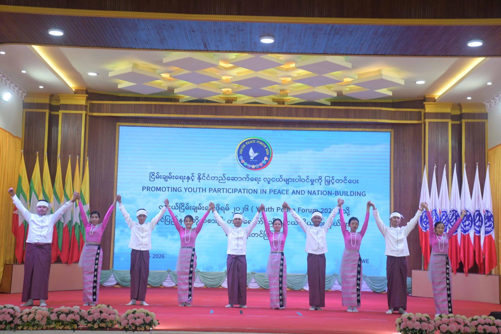ထို့နောက် ပြည်နယ်ဝန်ကြီးချုပ်က နိုင်ငံတော်အစိုးရအဆက်ဆက်က နိုင်ငံတော်ထာဝရငြိမ်းချမ်းရေးကို ကြိုးစားဆောင်ရွက်ခဲ့ကြသော်လည်း လွဲမှားသောအတွေးအခေါ်အယူအဆများနှင့် နိုင်ငံနှင့်တိုင်းရင်းသားပြည်သူများ အားလုံးအကျိုးထက် ကျဉ်းမြောင်းသည့် ကိုယ်ကျိုးအတ္တများကို ရှေ့တန်းတင်နေကြခြင်းကြောင့် လက်နက်ကိုင် ပဋိပက္ခများနှင့် ဆူပူအကြမ်းဖက်မှုများသည် ယနေ့ကာလအထိ ရှည်ကြာနေပြီး မိဘပြည်သူတိုင်းရင်းသားများ ဆင်းရဲဒုက္ခမျိုးစုံ ကြုံတွေ့နေရသည်မှာ ဝမ်းနည်းဖွယ်ရာဖြစ်ကြောင်း၊ နိုင်ငံတော်အနေဖြင့် ပြည်တွင်းငြိမ်းချမ်းရေးကို ဘက်ပေါင်းစုံ ကဏ္ဍပေါင်းစုံက အလေးထားဆောင်ရွက်လျက်ရှိရာ လူငယ်များကိုလည်း ပူးပေါင်းပါဝင်လာစေရန် ဆောင်ရွက်လျက်ရှိကြောင်း၊ ယခုကျင်းပမည့် လူငယ်ငြိမ်းချမ်းရေးဖိုရမ် ၂၀၂၆ (Youth Peace Forum 2026) အား ငြိမ်းချမ်းရေးနှင့်လူမှုအသိုက်အဝန်း တည်ငြိမ်ရေးတွင် အားလုံးပါဝင်သော လူငယ်များ၏ ဆောင်ရွက်ချက်များမှာ အရေးကြီးသည်ကို ပေါ်လွင်စေရန်၊ အပြုသဘောဆောင်သော ပတ်ဝန်းကျင်တစ်ရပ်တွင် နိုင်ငံသားအားလုံးနှင့် သက်ဆိုင်သော ကိစ္စရပ်များ၊ စိတ်သဘောထားများနှင့် ပတ်သက်၍ ဆွေးနွေးအဖြေရှာရန်နှင့် လူငယ်များအတွက် အခွင့်အလမ်းများ ဖန်တီးပေးရန်၊ ငြိမ်းချမ်းသော အသိုက်အဝန်းများ အပြန်အလှန်ဆက်သွယ် ဆောင်ရွက်မှုကို အထောက်အပံ့ဖြစ်စေရန်နှင့် ရွေးကောက်ပွဲလွန်ကာလ၌ လူငယ်များ၏ လက်တွေ့ကျသော အခန်းကဏ္ဍကို ဖော်ထုတ်ရန်၊ တွေ့ဆုံဆွေးနွေးခြင်း၊ ကြားဝင်ဖျန်ဖြေခြင်းနှင့် တာဝန်ယူမှုရှိသော ဆက်သွယ် ဆောင်ရွက်ခြင်းတို့တွင် လူငယ်များ၏ စွမ်းရည်များ ပိုမိုခိုင်မာလာစေရန်၊ ရေရှည်တည်တံ့သော ငြိမ်းချမ်းရေးနှင့်ပြန်လည်သင့်မြတ်ရေး၊ လူမှုရေးလုပ်ငန်းဆိုင်ရာ အနာဂတ်စီမံချက်တစ်ရပ် ရေးဆွဲနိုင်ရေး အထောက်အပံ့ ဖြစ်စေမည့် လူငယ်များ၏ အကြံပြုချက်များ ပေါ်ထွက်လာစေရန်၊ လူငယ်ငြိမ်းချမ်းရေးဖိုရမ်မှ ပေါ်ထွက်လာသည့် အကြံပြုချက်များကို စုစည်း၍ အနာဂတ်နိုင်ငံတော် တည်ဆောက်ရေးအတွက် လူငယ်မူဝါဒဆိုင်ရာ စာတမ်းတစ်ရပ် (Youth Policy Paper) အား ရေးဆွဲတင်ပြရန် စသောရည်ရွယ်ချက်များဖြင့် ကျင်းပပေးခြင်းဖြစ်ကြောင်း၊ နိုင်ငံတော်ငြိမ်းချမ်း ဖွံ့ဖြိုးရေးအတွက် နောင်အနာဂတ်ခေါင်းဆောင်ဖြစ်လာမည့် လူငယ်မျိုးဆက်သစ်များသည် တစ်ခေတ်ထက်တစ်ခေတ် ပိုမိုထူးချွန်ထက်မြက်စွာဖြင့် တွေ့ကြုံရမည့် စိန်ခေါ်မှုများကို ကျော်လွှားနိုင်ရန် လွန်စွာအရေးကြီးကြောင်း၊ နိုင်ငံ၏ဖွံ့ဖြိုးတိုးတက်ရေးကို ဆောင်ကြည်းပေးနိုင်သောသူများသည် လူငယ်များပင်ဖြစ်ကြောင်း၊ ထို့ကြောင့် လူငယ်များ ဘက်စုံထူးချွန်ပြီး အတတ်ပညာရှင်၊ အတတ်ပညာရှင်များ ထွက်ပေါ်စေရ