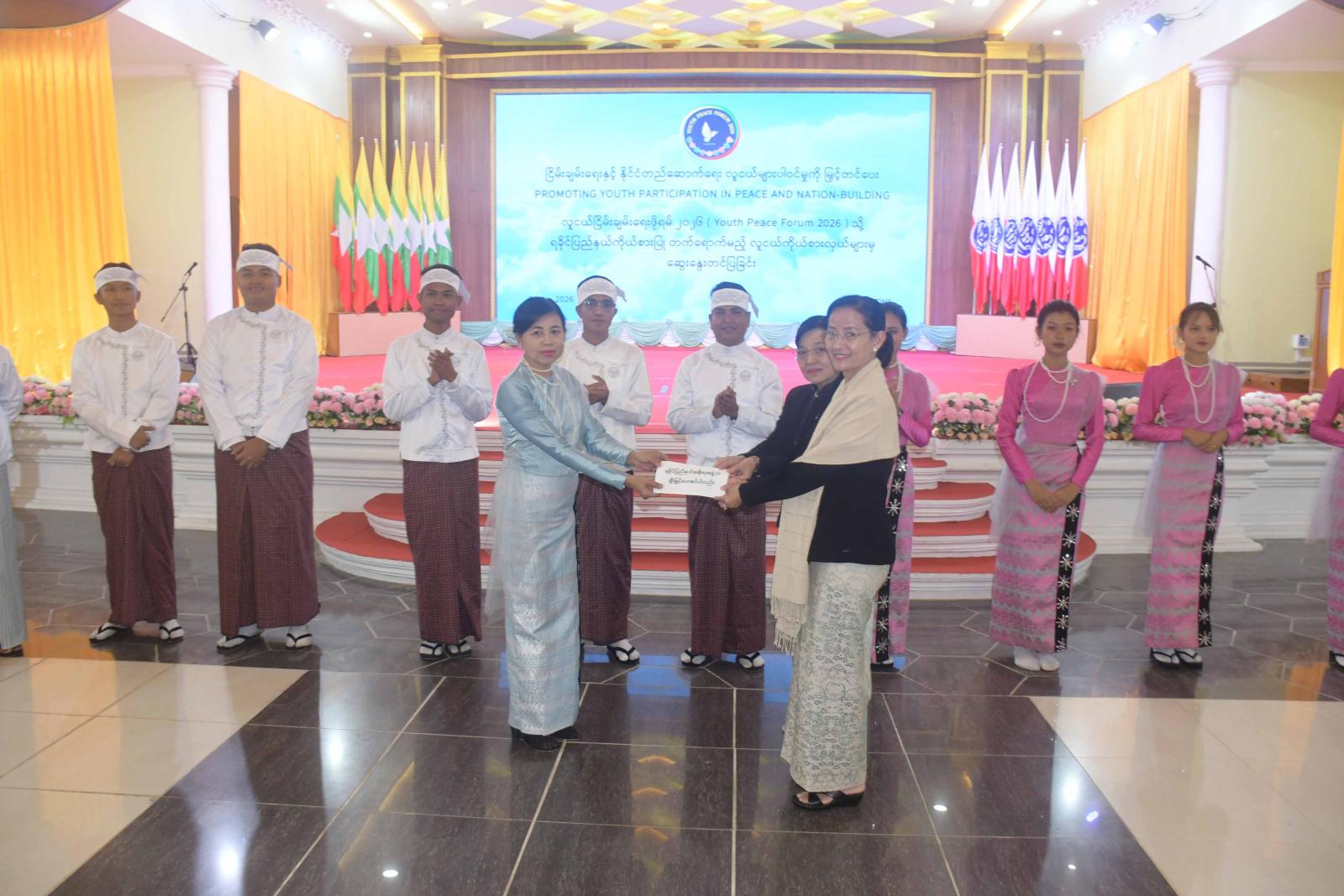 လူငယ်ငြိမ်းချမ်းရေးဖိုရမ် ၂၀၂၆ (Youth Peace Forum 2026) သို့ ရခိုင်ပြည်နယ် ကိုယ်စားပြု တက်ရောက်ကြမည့် လူငယ်ကိုယ်စားလှယ်များမှ ဆွေးနွေးတင်ပြခြင်း အခမ်းအနားကို ယနေ့နံနက်ပိုင်းက စစ်တွေမြို့၊ ဦးဥတ္တမခန်းမ၌ကျင်းပရာ ရခိုင်ပြည်နယ်ဝန်ကြီးချုပ် ဦးထိန်လင်းနှင့်ဇနီး ပြည်နယ်အမျိုးသမီးရေးရာအဖွဲ့နာယက ဒေါ်ဆွေဆွေမြတ်၊ ပြည်နယ်တရားလွှတ်တော်တရားသူကြီးချုပ်၊ ပြည်နယ်အစိုးရအဖွဲ့ဝင်များ၊ ဌာနဆိုင်ရာများ၊ လူငယ်ကိုယ်စားလှယ်များ၊ တက္ကသိုလ်များနှင့် အခြေခံပညာကျောင်းများမှ ဆရာ၊ ဆရာမများနှင့် ကျောင်းသား၊ ကျောင်းသူ၊ လူမှုရေး အဖွဲ့အစည်းများမှ ကိုယ်စားလှယ်များ၊ ဖိတ်ကြားထားသူများ တက်ရောက်ကြသည်။