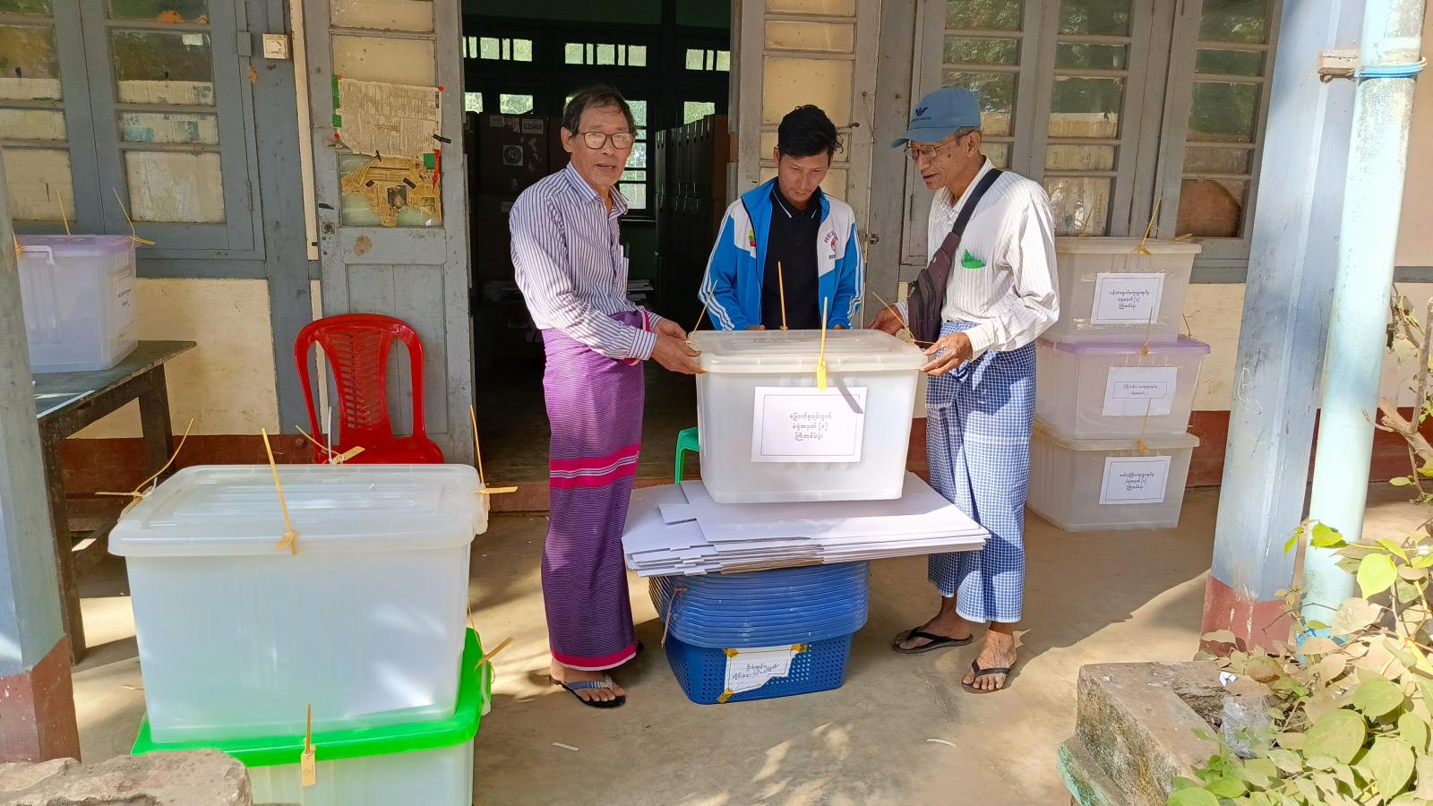 အဆိုပါ ပစ္စည်းများကို မြို့နယ်ရွေးကောက်ပွဲကော်မရှင်အဖွဲ့ခွဲဥက္ကဋ္ဌ ဦးစောရွှေသိန်းနှင့် အဖွဲ့ဝင်များ၊ ဝန်ထမ်းများတို့က မဲပုံး၊ လုံခြုံရေးကြိုး၊ မဲလက်မှတ်၊ မဲလက်မှတ်စာအိတ်သေး(ပြည်/မျိုး/တိုင်း)၊ ပုံစံ-၁၃ စာရွက်၊ မဲစာရင်းပုံစံ (၁)၊(၁-က)၊ ခြင်းတောင်းနှင့် ဆက်စပ်ပစ္စည်း စုစုပေါင်း (၂၁) မျိုးအား ရပ်ကွက်/ကျေးရွာရွေးကောက်ပွဲကော်မရှင်အဖွဲ့ခွဲများထံသို့ ထုတ်ပေးခဲ့သည်။