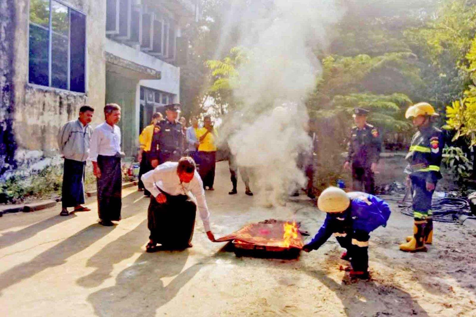 ထို့နောက် မြို့နယ်မီးသတ်ဦးစီးမှူးနှင့် မီးသတ်တပ်ဖွဲ့ဝင်များက မြန်မာ့ဆက်သွယ်ရေးလုပ်ငန်းရုံးရှိ ဝန်ထမ်းများနှင့်ပူးပေါင်းကာ မီးလောင်မှုဖြစ်ပွားပါက တည်ငြိမ်စွာဖြင့် စနစ်တကျ မီးငြှိမ်းသတ်စေရေး မီးသတ်ဆေးဘူးဖြင့် မီးငြှိမ်းသတ်ခြင်း၊ ရေစိုဝတ်ဖြင့် မီးငြှိမ်းသတ်ခြင်း၊ ဖုံးအုပ်နည်းဖြင့် မီးငြှိမ်းသတ်ခြင်းတို့ကို ဇာတ်တိုက်လေ့ကျင့်ဆောင်ရွက်ခဲ့ကြကြောင်း သိရသည်။
