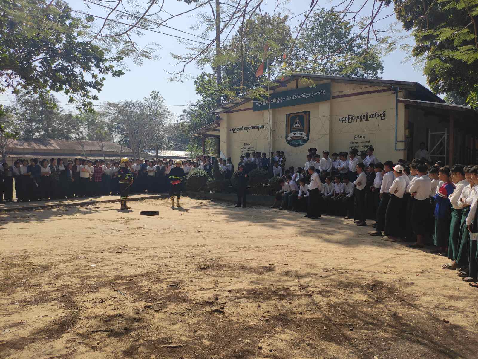 အသိပညာပေးဟောပြောပွဲတွင် မြို့နယ်မီးသတ်ဦးစီးဌာန မြို့နယ်မီးသတ်ဦးစီးအရာရှိ ဦးမင်းအောင်က မီးသတ်ဦးစီးဌာန၏ ရည်ရွယ်ချက်နှင့် ရည်မှန်းချက်တာဝန်ကြီး(၄)ရပ်၊ မီးဘေးအန္တရာယ်ကြောင့် ထိခိုက်နစ်နာဆုံးရှုံးမှု မရှိစေရေးအတွက် ကြိုတင်ကာကွယ်ရမည့် အချက်များ၊ မီးသတ်ဆေးဗူး၏အချက်အလက်များနှင့် အသုံးပြုပုံတို့ကို ဆရာ၊ ဆရာမများနှင့် ကျောင်းသား၊ ကျောင်းသူများအား ရှင်းလင်းပြောကြားခဲ့ပြီး မီးဘေးလုံခြုံရေးအသိပညာပေး လက်ကမ်းစာစောင်များကို ဆရာ၊ ဆရာမများနှင့် ကျောင်းသား၊ ကျောင်းသူများထံ ဖြန့်ဝေပေးခဲ့သည်။ ထို့နောက် မြို့နယ်မီးသတ်ဦးစီးအရာရှိ ဦးမင်းအောင်ဦးဆောင်သော သန္ဓေမီးသတ်တပ်ဖွဲ့ဝင်များက၊ ကျောင်းသား၊ ကျောင်းသူများအား ကိုယ်တိုင်မီးငြိမ်းသတ်နိုင်ရေး မီးသတ်ဆေးဘူးဖြင့် လက်တွေ့သရုပ်ပြဇာတ်တိုက်လေ့ကျင့်ပေးခဲ့ကြောင်း သိရသည်။