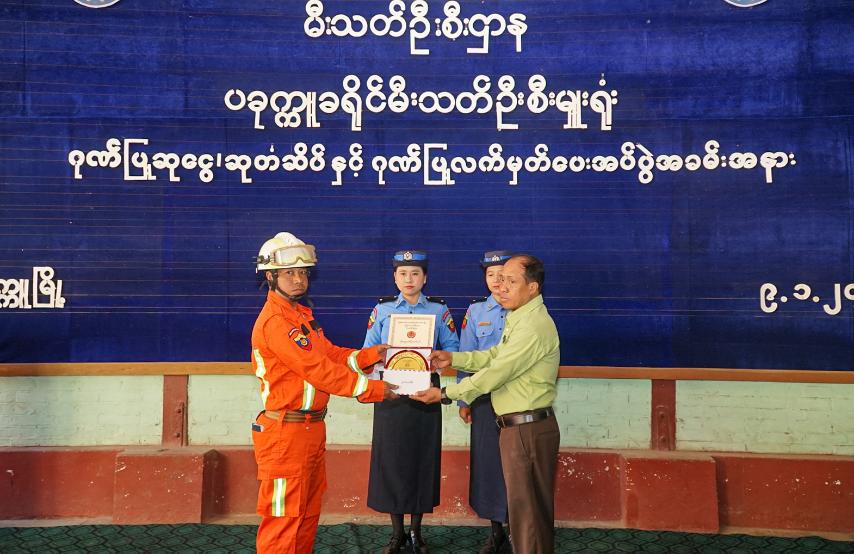 အဆိုပါမီးသတ်တပ်ဖွဲ့ဝင်များအား တစ်ဦးလျှင် ဆန်(၁၀)ပြည်၊ ဆီတစ်ပိဿာနှုန်းနှင့် အခြားစားသောက်ကုန်ပစ္စည်းများကို မြို့နယ်စီမံခန့်ခွဲရေးနှင့်အုပ်ချုပ်ရေးကော်မတီက ဂုဏ်ပြုချီးမြှင့်ခဲ့ကြကြောင်း သိရသည်။