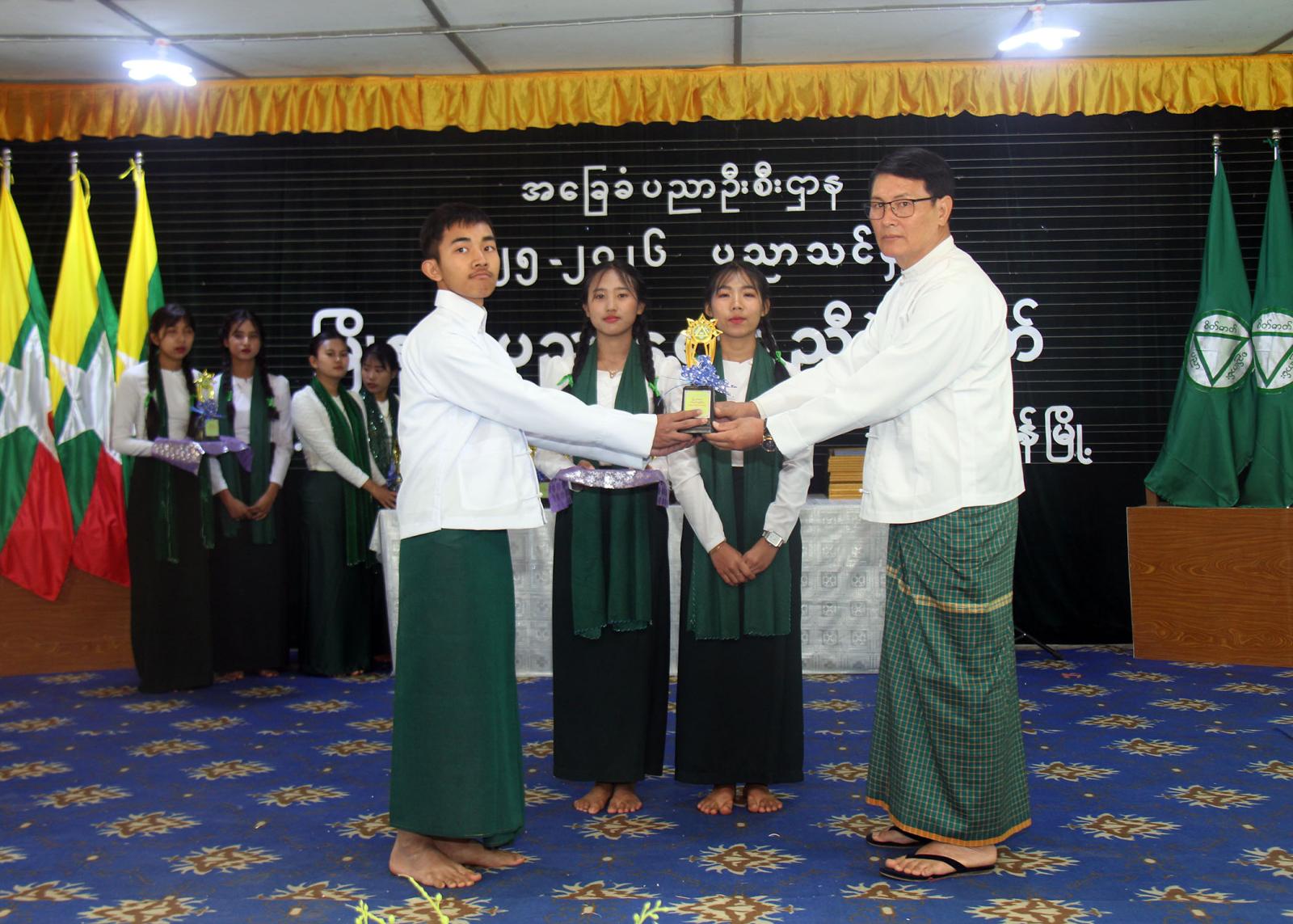 ထို့နောက် မြို့နယ်စီမံခန့်ခွဲရေးနှင့်အုပ်ချုပ်ရေးကော်မတီဥက္ကဋ္ဌ ဦးနေမျိုးထွန်းက ပြည်နယ်အဆင့် ဆို၊ က၊ ရေး၊ တီး ပြိုင်ပွဲတွင် ဆုရရှိသော ကျောင်းသား၊ ကျောင်းသူများနှင့် ပြည်နယ်အဆင့် အားကစားပြိုင်ပွဲများတွင် ဆုရရှိသော ကျောင်းသား၊ ကျောင်းသူများကို ဆုတံဆိပ်နှင့်ဂုဏ်ပြုဆုငွေများ ပေးအပ်ချီးမြှင့်ခဲ့သည်။