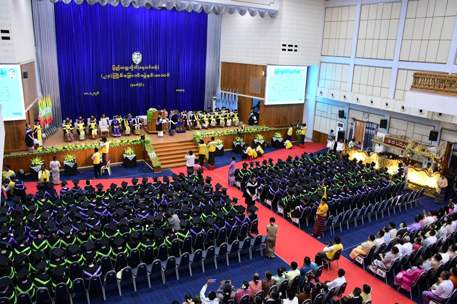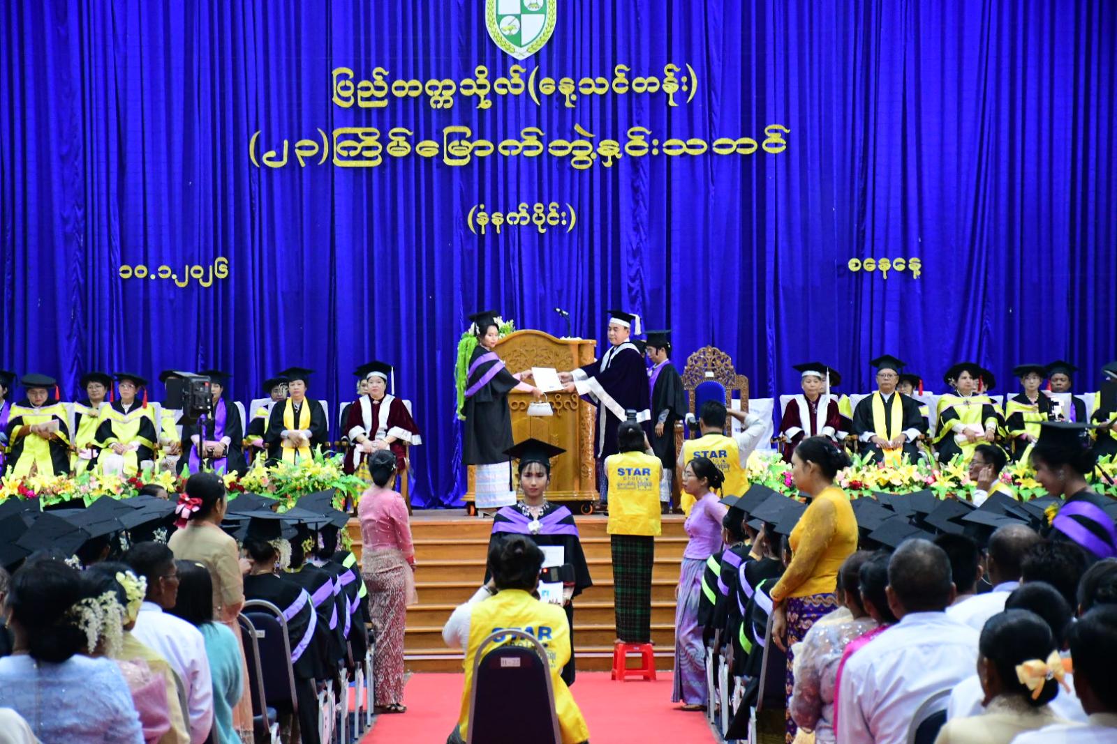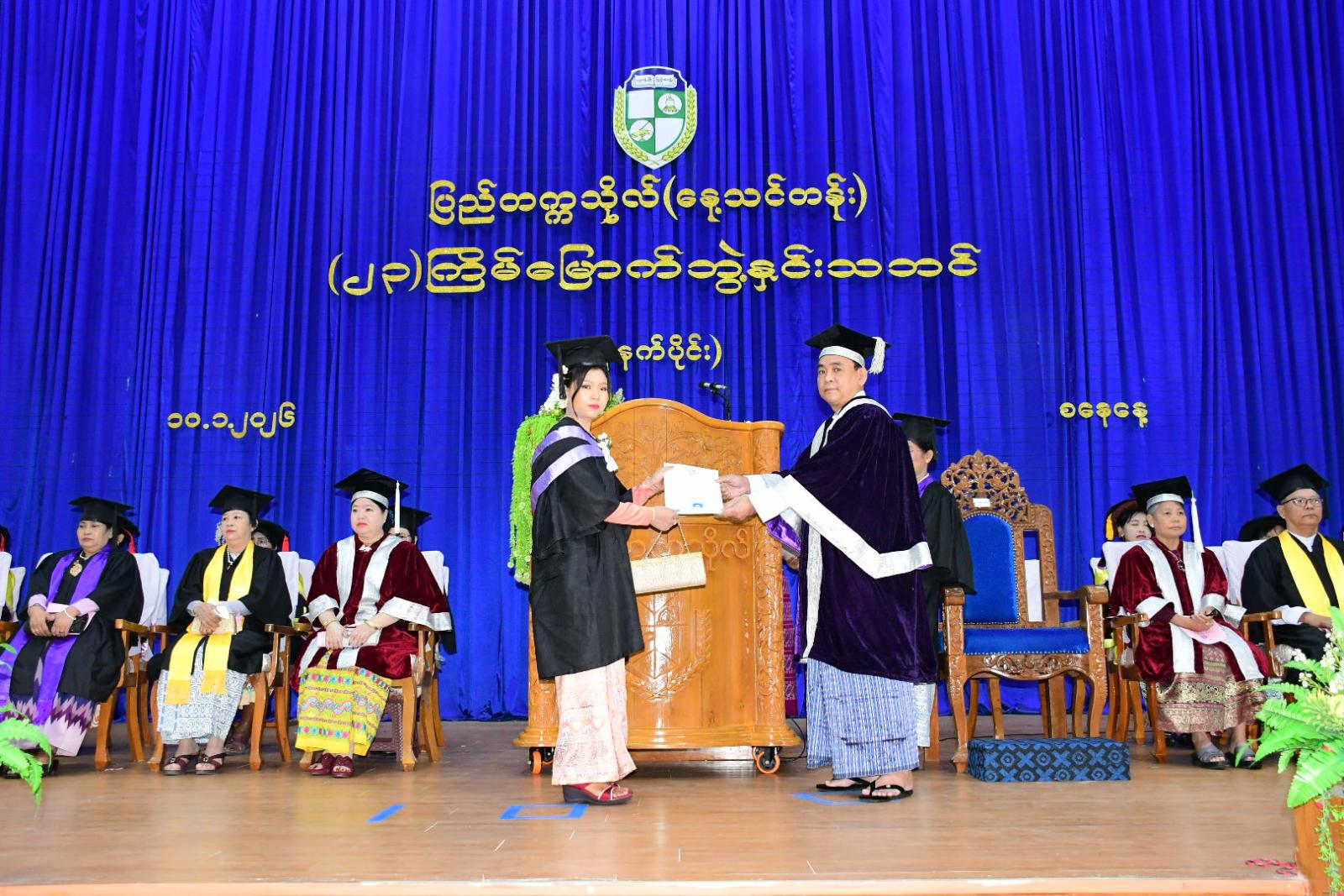 ယင်းနောက် ဘာသာရပ်အလိုက် ကောင်းစွာအောင်မြင်ပေါက်မြောက်ခဲ့ပြီဟု ပညာရေးအဖွဲ့က ကြေညာပြီးဖြစ်သော ပြည်တက္ကသိုလ် ဘာသာရပ်ပေါင်းစုံမှဘွဲ့ရကျောင်းသား၊ ကျောင်းသူများအား ပါမောက္ခချုပ်က ဘွဲ့လက်မှတ်များ အသီးသီးအပ်နှင်းချီးမြှင့်ပေးအပ်သည်။
