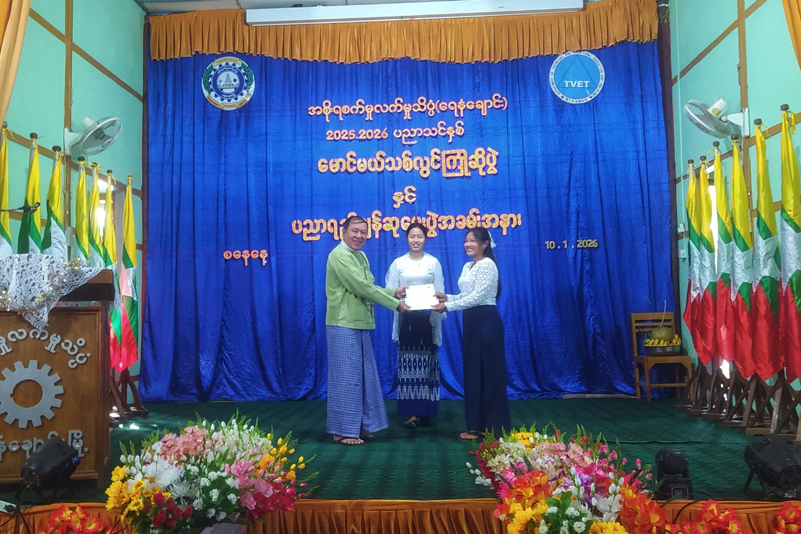 ယင်းနောက် အစိုးရစက်မှုလက်မှုသိပ္ပံ(ရေနံချောင်း)မှ ၂၀၂၄-၂၀၂၅ ပညာသင်နှစ် သင်တန်းအသီးသီးတွင် ထူးချွန်စွာအောင်မြင်ခဲ့ကြသည့် ကျောင်းသား၊ ကျောင်းသူများအား မြို့နယ်စီမံခန့်ခွဲရေးနှင့်အုပ်ချုပ်ရေးကော်မတီဥက္ကဋ္ဌနှင့် ကျောင်းအုပ်ဆရာမကြီးတို့က ပညာရည်ချွန်ဆုများ ချီးမြှင့်ပေးအပ်ခဲ့ပြီး ကျောင်းသား၊ ကျောင်းသူများက ဖျော်ဖြေရေး အစီအစဉ်များဖြင့် မောင်မယ်သစ်လွင်များကို ပျော်ရွှင်စွာကြိုဆိုခဲ့ကြကြောင်း သိရသည်။