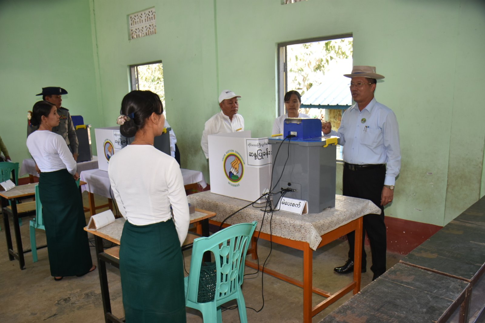 ဆက်လက်၍ တိုင်းဒေသကြီးဝန်ကြီးချုပ်နှင့် တာဝန်ရှိသူများသည် ကျုံပျော်ခရိုင်၊ ကျောင်းကုန်းမြို့နယ်၊ တံခွန်တိုင်ကျေးရွာအုပ်စု၊ မဲရုံအမှတ်(၁)သို့ သွားရောက်၍ မဲရုံပြင်ဆင်ဆောင်ရွက်ထားရှိမှုများအား ကြည့်ရှုစစ်ဆေးခဲ့ပြီး ပြည်သူများစိတ်အေးချမ်းသာစွာ ဆန္ဒမဲပေးနိုင်ရေး၊ ဆန္ဒမဲလာရောက်ပေးသူများ စနစ်တကျနှင့် အလွယ်တကူ မဲပေးနိုင်ရေး စီစဉ်ဆောင်ရွက်ထားရှိရန်တို့ကို မှာကြားခဲ့သည်။