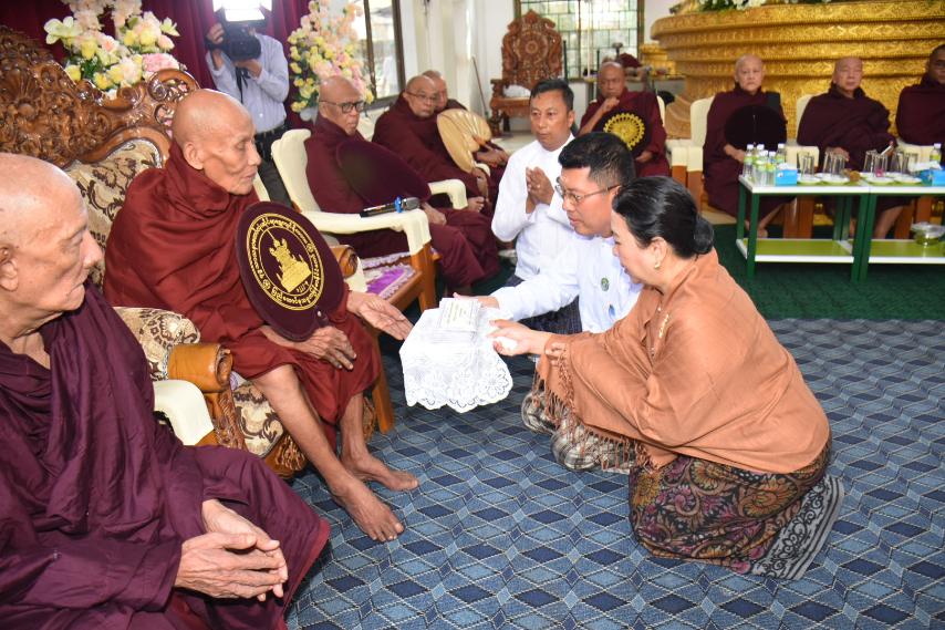 ထို့နောက် ဘဒ္ဒန္တပညာဓိက (အဂ္ဂမဟာပဏ္ဍိတ၊ အဂ္ဂမဟာသဒ္ဓမ္မဇောတိကဓဇ၊ အဂ္ဂမဟာဂန္ထ ဝါစကပဏ္ဍိတ၊ ပုသိမ်မြို့ ဝိနည်းပြန်ဌာန၊ ဂိုဏ်းအုပ်ဆရာတော်၊ မောင်းထောင်ကျောင်းပရိယတ္တိစာသင်တိုက်၊ ပုသိမ်မြို့)နှင့် ပုသိမ်မြို့၊ မြောင်းမြကျောင်းပရိယတ္တိစာသင်တိုက် ပဓာနနာယကဆရာတော်(အဂ္ဂမဟာပဏ္ဏိတ၊ အဂ္ဂမဟာသဒ္ဒမ္မဇောတိကဓဇ၊ အဂ္ဂမဟာဂန္တဝါစကပဏ္ဏိတ)ဘဒ္ဒန္တဝဏ္ဏိတာဘိဝံသတို့က ဩဝါဒကထာ ချီးမြှင့်တော်မူပြီး ဆရာတော်ကြီးများအား တိုင်းဒေသကြီးဝန်ကြီးချုပ်နှင့်ဇနီးက လှူဖွယ်ဝတ္ထုပစ္စည်းများ ဆက်ကပ်လှူဒါန်းခဲ့သည်။ ယင်းနောက် တိုင်းဒေသကြီးဝန်ကြီးချုပ်နှင့် ဇနီးမိသားစုတို့က အရုဏ်ဆွမ်း၊ နေ့ဆွမ်းနှင့် ညနေအချိုရည် တစ်နေ့တာ အာဟာရအတွက် အလှူငွေများကိုလည်းကောင်း၊ ဒေါက်တာညွန့်ဖေနှင့် ဇနီးမိသားစုတို့က စာဖြေ စာပြန်ပွဲမတည်အလှူတော်ငွေနှင့် ဓမ္မပူဇာတရားအလှူတော်ငွေများကိုလည်းကောင်း ပေးအပ်လှူဒါန်းရာ ပုသိမ်ခရိုင်လုံးဆိုင်ရာ ရွှေကျင်နိကာယ ဝိနယဓမ္မစာဖြေစာပြန်ပွဲတော်ကျင်းပရေးကော်မတီဥက္ကဌက လက်ခံရယူခဲ့ပြီး ဂုဏ်ပြုမှတ်တမ်းလွှာများပြန်လည်ပေးအပ်ခဲ့သည်။