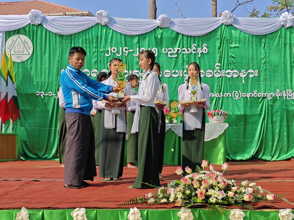 ထို့နောက် ၂၀၂၄-၂၀၂၅ ပညာသင်နှစ်တွင် ထူးချွန်စွာအတန်းတက်သွားခဲ့ကြသော ကျောင်းသား၊ ကျောင်းသူလေးများ၊ ကာယ၊ ဉာဏနှင့် ရှမ်းတိုင်းရင်းသားစာပေထူးချွန်ဆုများကို မြို့နယ်စီမံခန့်ခွဲရေးနှင့်အုပ်ချုပ်ရေးကော်မတီအဖွဲ့ဝင် ဦးငိုပွယ်၊ တာဝန်ခံမြို့နယ်ပညာရေးမှူးနှင့် တာဝန်ရှိသူများက ဆုများအသီးသီးချီးမြှင့် ပေးအပ်ခဲ့ကြပြီး ကျောင်းသား ၊ ကျောင်းသူလေးများက အကပဒေသာများဖြင့် ဖျော်ဖြေပေးခဲ့ကြောင်းသိရသည်။