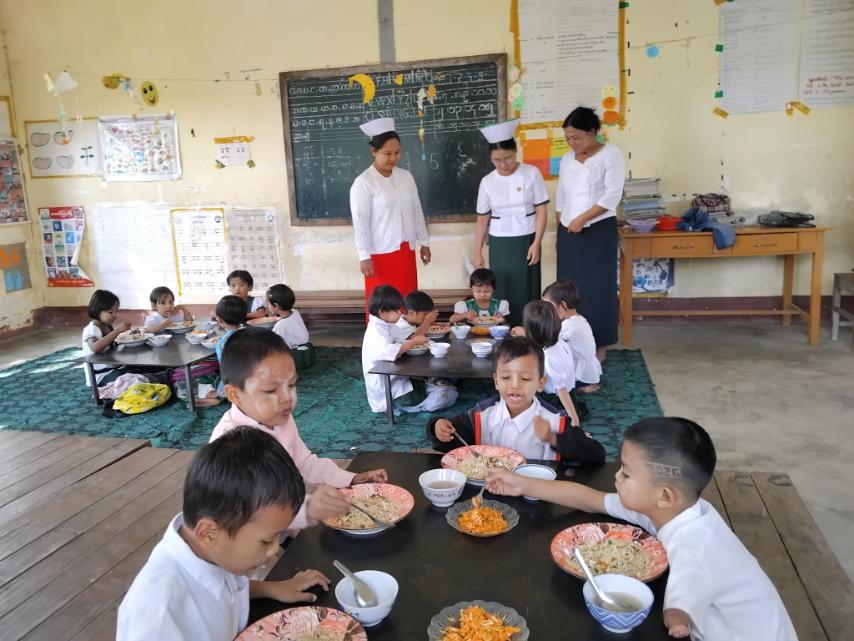 ထိုသို့ဆောင်ရွက်ရာတွင် အခြေခံပညာကျောင်းများရှိ ကျောင်းအုပ်ဆရာကြီးများနှင့် ဆရာမများက KG ကျောင်းသား၊ ကျောင်းသူတို့အား အသားဓါတ်၊ အဆီဓါတ်၊ ဗီတာမင်ဓါတ်နှင့် ရေဓါတ်စသည်တို့ပါဝင်သော အာဟာရဖြစ်စေမည့် စားသောက်ဖွယ်ရာများကို ကျွေးမွေးခဲ့ကြသည်။