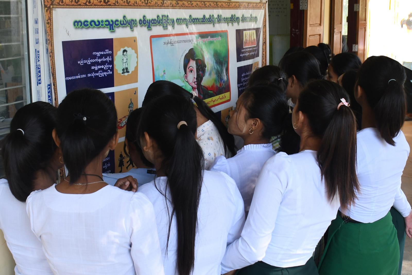 ဆွေးနွေးပြီးနောက် ကျောင်းသား၊ ကျောင်းသူများက နံရံကပ်စာစောင်များ၊ စာဖတ်ရှိန်မြှင့်တင်ရေး အသိပညာပေး စာအုပ်စာစောင်များကို လေ့လာကြည့်ရှုကြသည်။