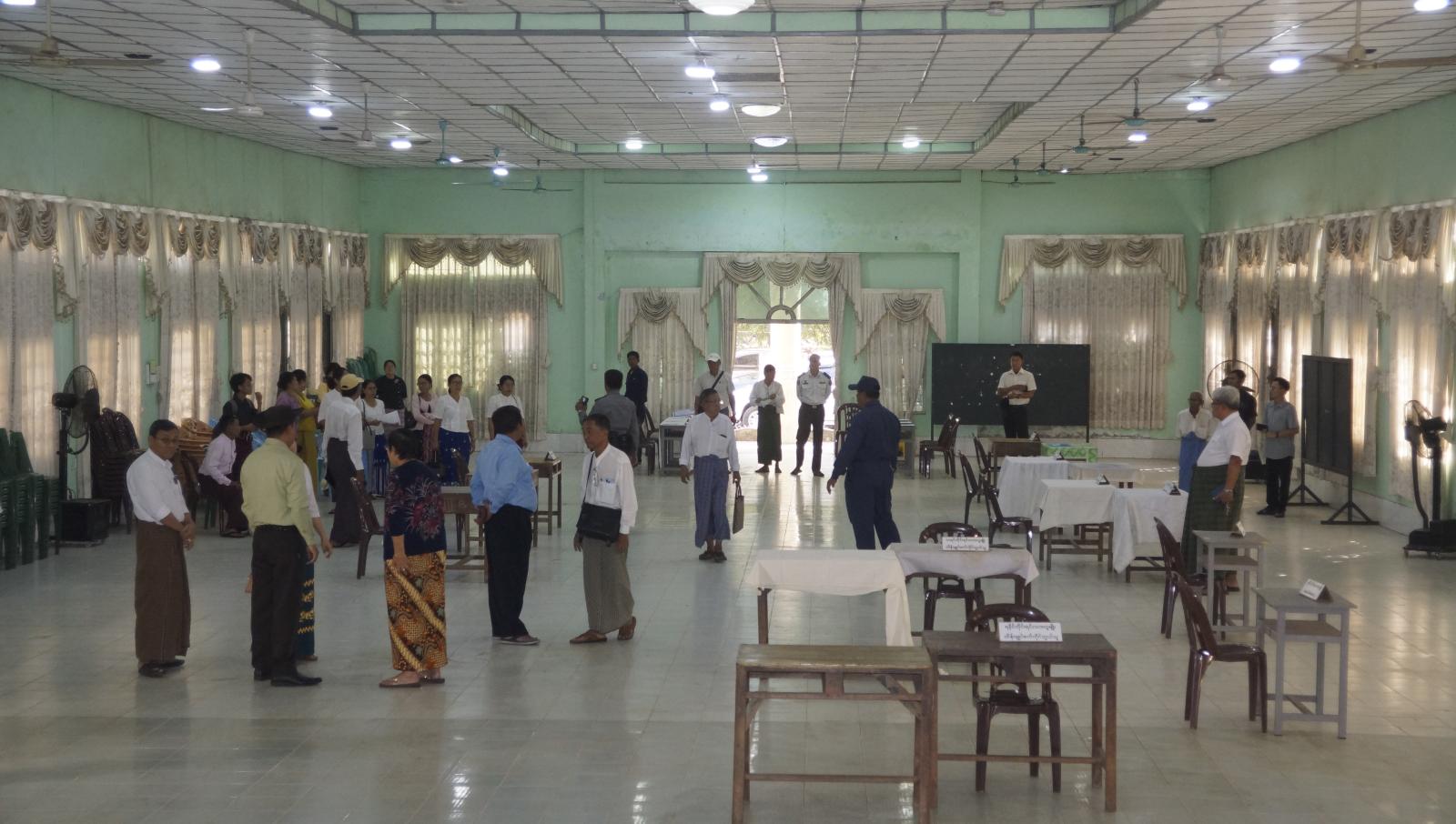 ဒဂုံမြို့နယ် အမှတ် (၂) အခြေခံပညာအထက်တန်းကျောင်း ဦးဘလွင်ခန်းမ၌ ဖွင့်လှစ်မည့် စံပြမဲရုံ ၂ တွင် မြို့နယ်စီမံခန့်ခွဲရေးနှင့် အုပ်ချုပ်ရေးကော်မတီအတွင်းရေးမှူး ရဲမှူးမျိုးဝင်းက မဲရုံခင်းကျင်းမှု ပုံစံများအား စနစ်တကျဆောင်ရွက်ထားရှိနိုင်ရေးဌာနဆိုင်ရာ တာဝန်ရှိသူများအား သရုပ်ပြရှင်းလင်းဆွေးနွေးခဲ့ကြောင်း သိရသည်။