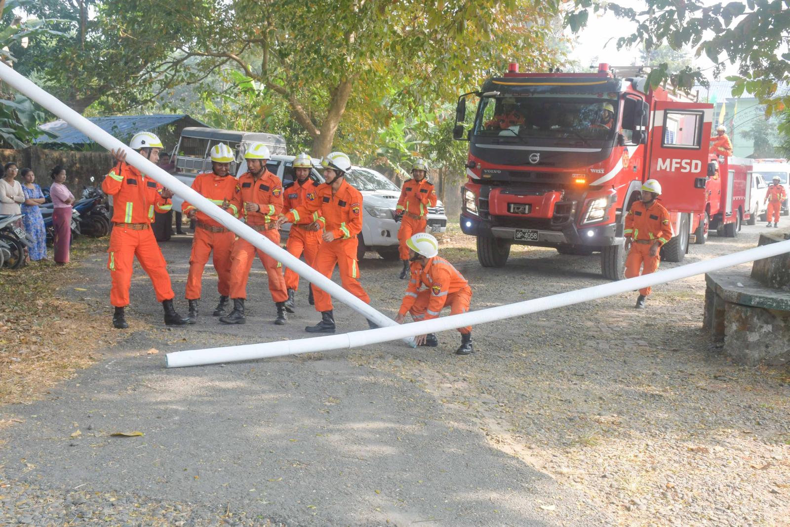 ထို့နောက် ငလျင်ဘေးအန္တရာယ် သဏ္ဌာန်တူဇာတ်တိုက် လေ့ကျင့်မှုကို ဆရာ၊ ဆရာမများ၊ ကျောင်းသား၊ ကျောင်းသူများ၊ ဌာနဆိုင်ရာများ၊ မီးသတ်တပ်ဖွဲ့ဝင်များ၊  ကြက်ခြေနီတပ်ဖွဲ့ဝင်များ၊ ပရဟိတအဖွဲ့များနှင့်အတူ ဆောင်ရွက်ကြရာ ပြည်နယ် ဝန်ကြီးချုပ်နှင့်ဇနီး၊ တာဝန်ရှိသူများက လှည့်လည်ကြည့်ရှုအားပေးကြသည်။