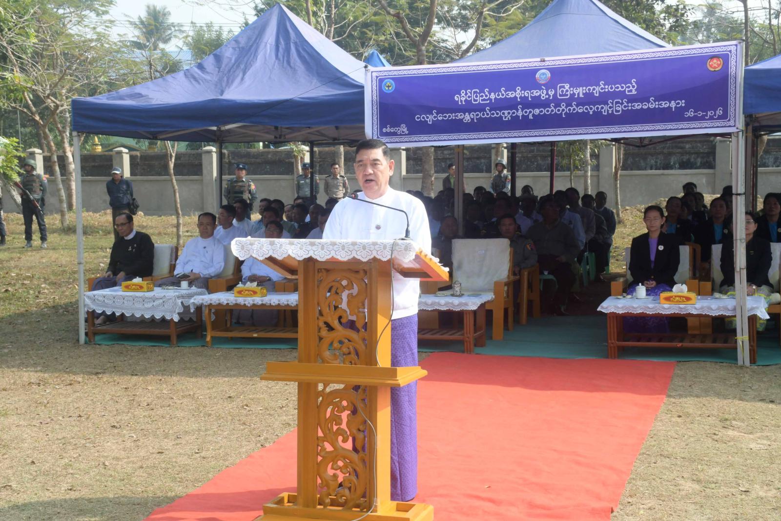 ဦးစွာ ရခိုင်ပြည်နယ် သဘာဝဘေးအန္တရာယ်ဆိုင်ရာ စီမံခန့်ခွဲမှုအဖွဲ့ ဥက္ကဋ္ဌ ပြည်နယ်ဝန်ကြီးချုပ် ဦးထိန်လင်းကယနေ့ကျင်းပသည့် အခမ်းအနားသည် ငလျင်ဘေးအန္တရာယ် သဏ္ဌာန်တူဇာတ်တိုက် လေ့ကျင့်ခြင်းအခမ်းအနားဖြစ်ကြောင်း၊ ရခိုင်ပြည်နယ်အတွင်း ငလျင်ဘေးအန္တရာယ် ကျရောက်လာပါက ကြိုတင်ပြင်ဆင်ရေး၊ တုံ့ပြန်ဆောင်ရွက်ရေး လုပ်ငန်းများကို ထိထိရောက်ရောက် ဆောင်ရွက်နိုင်စေရန်နှင့်  အခြေခံပညာကျောင်းများမှ ကျောင်းသား၊ ကျောင်းသူများအနေဖြင့် ငလျင်ဘေးအန္တရာယ်နှင့်ပတ်သက်၍ ကြိုတင်ပြင်ဆင် ခြင်း၊ တုံ့ပြန်ဆောင်ရွက်ခြင်းများကို ကိုယ်တိုင်ပါဝင် ဆောင်ရွက်ခြင်းဖြင့် ငလျင်ဘေး အန္တရာယ်နှင့် ရင်ဆိုင်ကြုံတွေ့လာပါက ထိခိုက်ဆုံးရှုံးမှု အနည်းဆုံးဖြင့် ကိုယ်တိုင်တုံ့ပြန် ဆောင်ရွက်ရမည့် နည်းလမ်းများကို နားလည်သဘောပေါက်လာစေရန် ရည်ရွယ်ပြီး ကျင်းပ ပေးရခြင်းဖြစ်ကြောင်း၊ သဘာဝဘေးအန္တရာယ်များကို ဖြစ်လာမှ ရင်ဆိုင်တုံ့ပြန်ခြင်းထက် ဘေးမဖြစ်ပွားမီ ကြိုတင်ကာကွယ်ခြင်း၊ ကြိုတင်ပြင်ဆင်‌ဆောင်ရွက်ခြင်းသည် အကောင်းဆုံး နှင့် အထိရောက်ဆုံးသော နည်းလမ်းဖြစ်ပါကြောင်း၊ ကြိုတင်ပြင်ဆင်ဆောင်ရွက်ခြင်းဖြင့် ဘေးအန္တရာယ်များကို စနစ်တကျရင်ဆိုင်တုံ့ပြန် ဆောင်ရွက်နိုင်ပြီး လူ့အသက်၊ အိုးအိမ်၊ စည်းစိမ်များ ထိခိုက်ဆုံးရှုံးမှုများကို လျော့နည်းသက်သာစေမည်ဖြစ်ကြောင်း၊ ငလျင်ဘေး အန္တရာယ်သည် မည်သည့်နေ့၊ မည်သည့်အချိန်၊ မည်သည့်နေရာတွင် လှုပ်ခတ်မည်ဆိုသည်ကို ကြိုတင်ခန့်မှန်း၍မရသည့်အတွက် ငလျင်ဘေးအန္တရာယ် ရင်ဆိုင်တုံ့ပြန်နိုင်ရေးကို ပိုမိုအလေး ထားစီမံဆောင်ရွက်ရမည်ဖြစ်ကြောင်း၊ ယခုကဲ့သို့ ငလျင်ဘေးအန္တရယ် သဏ္ဍန်တူဇာတ်တိုက် လေ့ကျင့်ခန်းများ ကျင်းပပြုလုပ်ခြင်းအားဖြင့် အရေးပေါ်အခြေအနေကြုံတွေ့လာပါက ထိခိုက်ဆုံးရှုံးမှုအနည်းဆုံးဖြင့် ကိုယ်တိုင် စနစ်တကျတုံ့ပြန်ဆောင်ရွက်နိုင်မည်ဖြစ်ကြောင်းနှင့် ဇာတ်တိုက်လေ့ကျင့်ရာတွင် ကိုယ်တိုင် ပါဝင်ဆောင်ရွက်ခြင်းဖြင့် ကျောင်းသား၊ ကျောင်းသူများအနေဖြင့်  မိမိတို့တစ်ဦးချင်း ကိုယ်စီတာဝန်ရှိကြခြင်းကို သိရှိနားလည်ပြီး ဘေးအန္တရာယ် ကျရောက်လာချိန်တွင် တစ်ဦးချင်းမှ တစ်မိသားစုချင်း၊ တစ်မိသားစုချင်းမှ တစ်ဖွဲ့ချင်း၊ အဖွဲ့လိုက်ဌာနဆရာအဖွဲ့ အစည်းများနှင့် ပူးပေါင်း၍ ကိုယ်တိုင်စနစ်တကျ ပါဝင်ဆောင်ရွက်စေခြင်းဖြင့် ဘေးအန္တရာယ်များမှ ကြံ့ကြံ့ခံကျော်လွှားနိုင်သည့် လူ့အဖွဲ့ အစည်းများပေါ်‌ပေါက်လာမည် ဖြစ်ကြောင်းနှင့် ပူးပေါင်းပါဝင်ကူညီပေးကြသော ဆရာ၊ ဆရာမများ၊ ကျောင်းသား၊ ကျောင်းသူများ၊ ဌာနဆိုင်ရာအဖွဲ့အစည်းများ၊ မီးသတ်တပ်ဖွဲ့ ဝင်များ၊ ကြက်ခြေနီတပ်ဖွဲ