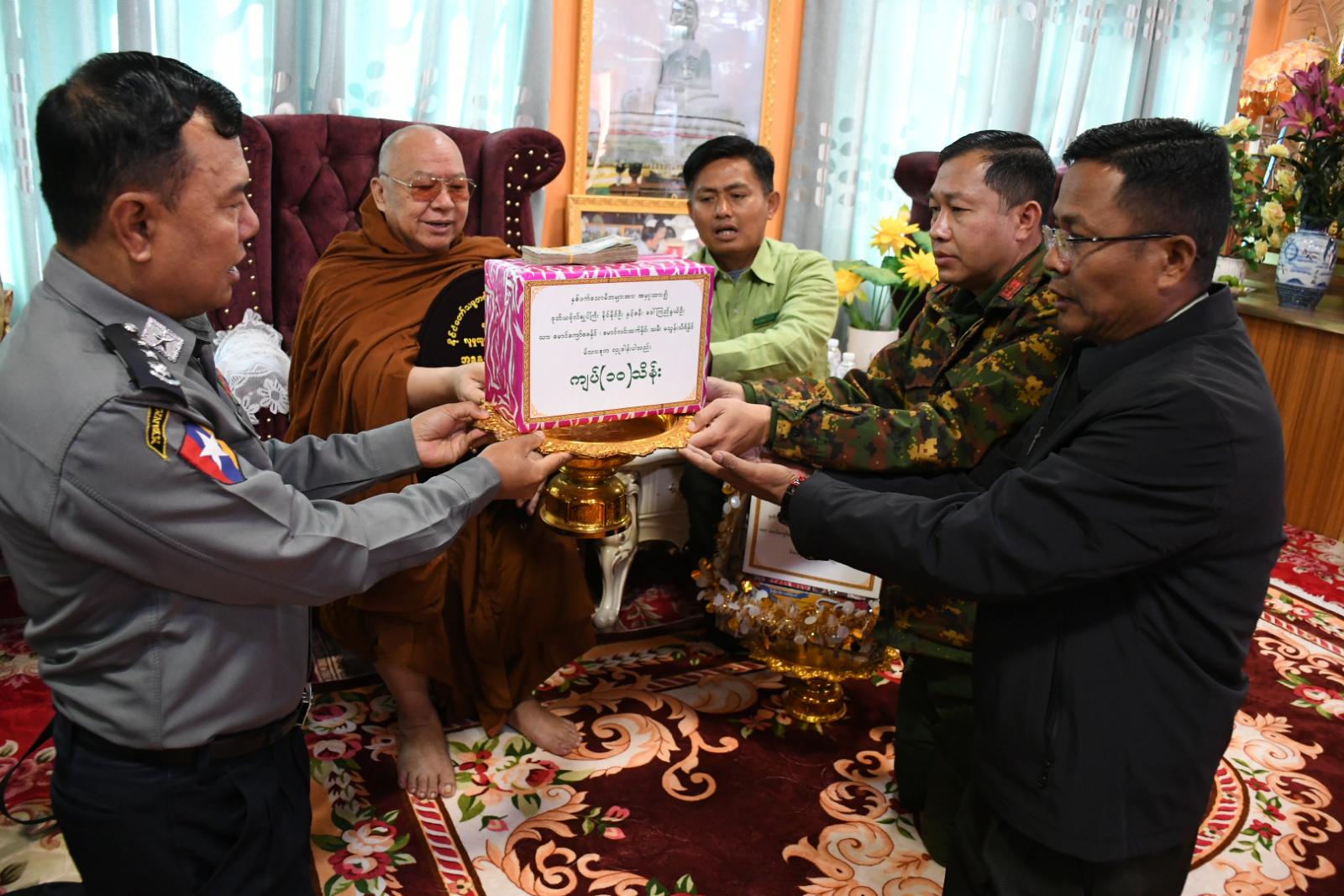 ထို့နောက်ဆရာတော်သံဃာတော်အရှင်သူမြတ်များက ချီးမြှင့်တော်မူအပ်သော ပရိတ်တရားတော် များကို ရိုသေစွာနာယူခဲ့ပြီး ဒုတိယဗိုလ်ချုပ်ကြီး နိုင်နိုင်ဦး မိသားစုကိုယ်စား တက်ရောက်လာကြသည့် အရှေ့မြောက်တိုင်းစစ်ဌာနချုပ် ဒုတိယတိုင်းမှူး၊ ပြည်နယ်အစိုးရ အုပ်ချုပ်ရေးအဖွဲ့ခွဲ (ရှမ်းမြောက်) ဥက္ကဋ္ဌ၊ ခရိုင်စီမံခန့်ခွဲရေးနှင့်အုပ်ချုပ်ရေးကော်မတီဥက္ကဋ္ဌနှင့်တာဝန်ရှိသူများက လှူဖွယ်ဝတ္ထု အစုစုတို့အား ဆရာတော်သံဃာတော် အရှင်သူမြတ်များထံသို့ ဆက်ကပ်လှူဒါန်းခဲ့သည်။