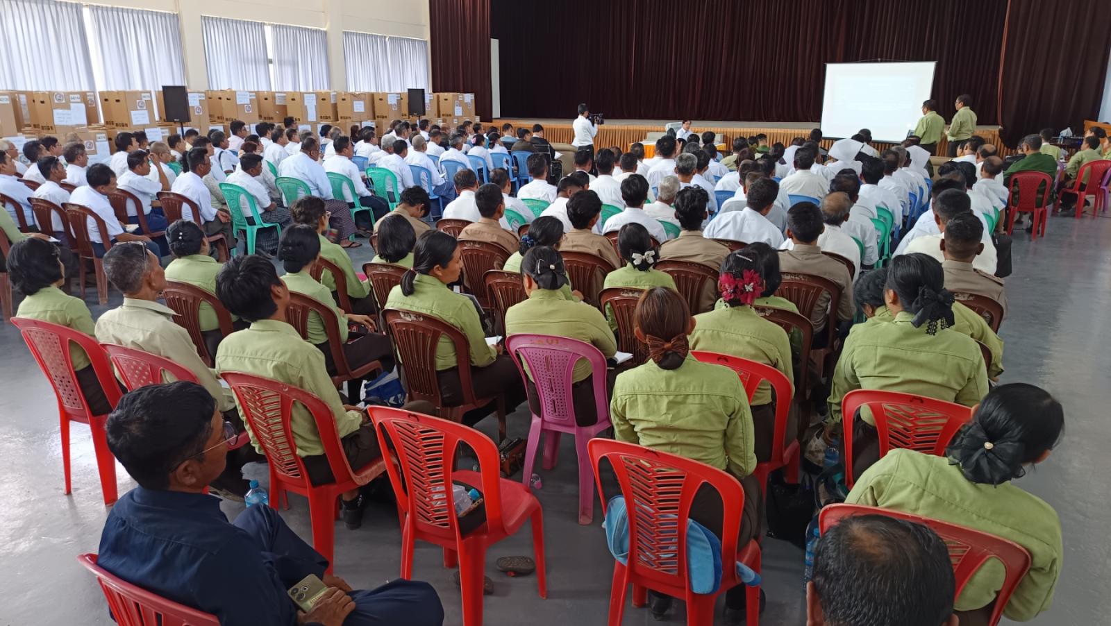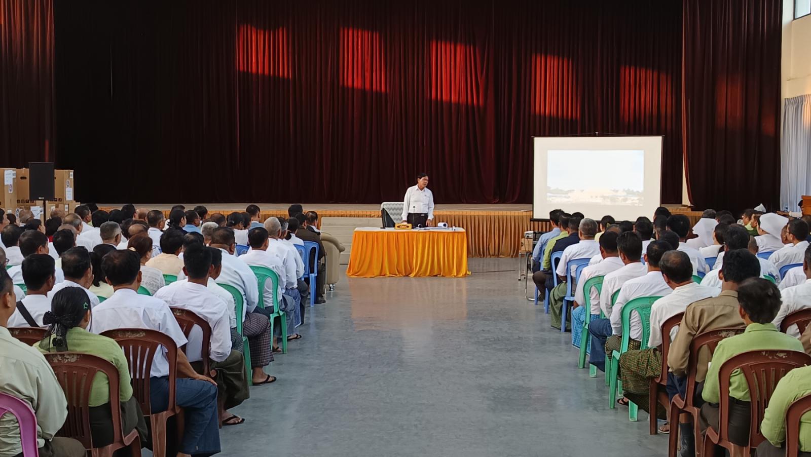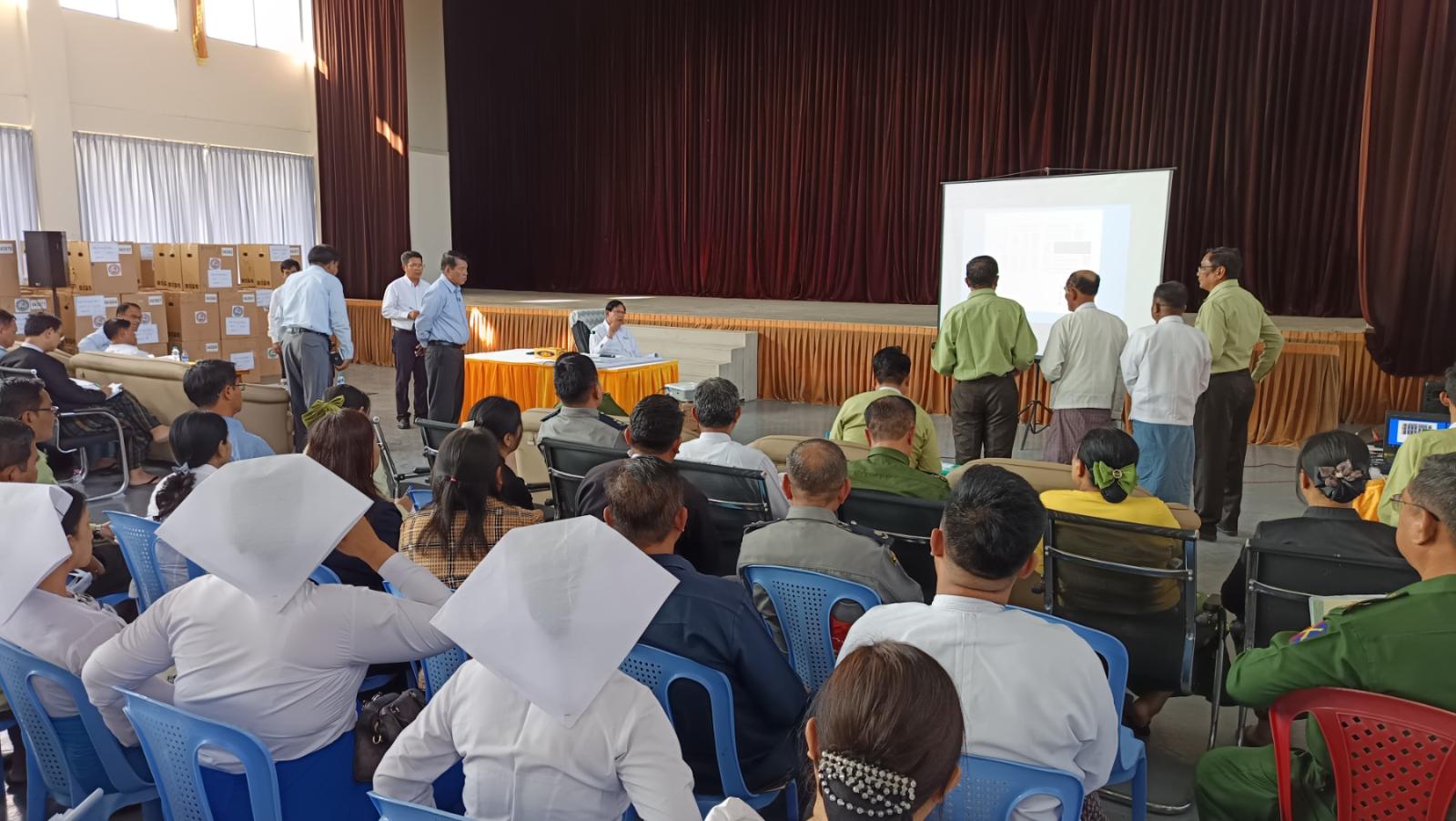ရှေးဦးစွာ ၂၀၂၆ ခုနှစ် ဇန်နဝါရီလ(၂၅)ရက်နေ့တွင် ကျင်းပပြုလုပ်မည့် ပါတီစုံဒီမိုကရေစီ အထွေထွေရွေးကောက်ပွဲ အပိုင်း(၃) အောင်မြင်စွာကျင်းပနိုင်ရေးအတွက် ခရိုင်စီမံခန့်ခွဲရေးနှင့်အုပ်ချုပ်ရေးကော်မတီဥက္ကဋ္ဌ ဦးအောင်ကိုနှင့် မြို့နယ်စီမံခန့်ခွဲရေးနှင့် အုပ်ချုပ်ရေးကော်မတီဥက္ကဋ္ဌ ဦးသန့်ဇော်တို့က မြို့နယ်အတွင်းမဲရုံ(၉၆)ရုံနှင့် ကရင်၊ ရခိုင် တိုင်းရင်းသားမဲဆန္ဒရှင်များအပါအဝင် မဲဆန္ဒရှင်(၁၁၆၃၀၄)ဦးရှိပါကြောင်း၊ မဲဆန္ဒရှင်အင်အားအလိုက် မဲရုံစာရင်းများ၊ မြို့နယ်အတွင်း မဲရုံများတွင်မဲရုံမှူး၊ ဒုမဲရုံမှူး၊ မဲရုံအဖွဲ့ဝင်များဖွဲ့စည်းထားရှိမှုများ၊ မြို့နယ်အတွင်း မြေပြင်ကွင်းဆင်းစစ်ဆေးမှုများ၊ အသံချဲ့စက်ဖြင့် လှည့်လည်နှိုးဆော်ဆောင်ရွက်မှုများ၊ လက်ကမ်းစာစောင်ဖြန့်ဝေနိုင်မှုများ၊ မဲရုံအမျိုးအစားများ၊ အခြေခံပညာကျောင်း(၁)ကျောင်းချင်းစီအလိုက် မဲရုံဖွင့်လှစ်မှုအခြေအနေများ၊ မဲရုံအရေအတွက်၊ မဲရုံတည်နေရာနှင့် Hand Speaker လိုအပ်ချက်များကို ဆွေးနွေးတင်ပြခဲ့သည်။