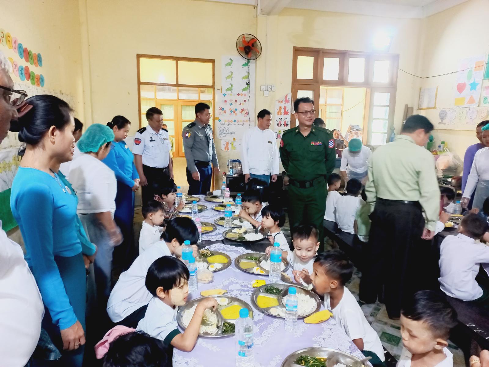 ထို့သို့ဆောင်ရွက်ရာတွင် မြို့နယ်စီမံခန့်ခွဲရေးနှင့် အုပ်ချုပ်ရေးကော်မတီဥက္ကဋ္ဌ ဦးခင်မောင်ဦးနှင့် အဖွဲ့ဝင်များ၊ မြို့နယ်ပြည်သူ့ကျန်းမာရေးဦးစီးဌာနမှူး ဒေါက်တာစန်းဝင်းနှင့်ဝန်ထမ်းများ၊ အခြေခံပညာဦးစီးဌာနမှ မြို့နယ်ဒုတိယပညာရေးမှူး ဦးညွှန်စန်းဝင်း၊ မိခင်နှင့်ကလေး စောင့်ရှောက်ရေးအသင်းအဖွဲ့များ၊ အမျိုးသမီးရေးရာအဖွဲ့ဝင်များက အေ(၉)လမ်း အ.မ.က နှင့် ချမ်းမြေ့သာယာ အ.မ.ကကျောင်းတို့မှ KG ကျောင်းသား/သူလေးများအား အာဟာရကျွေးမွေးခြင်းအပြင် တန်ဖိုးသင့်၍ သန့်ရှင်းပြီးအာဟာရပြည့်ဝသော အစားအစာများ စားသုံးနေမှုများကိုကြည့်ရှုအားပေးခဲ့သည်။