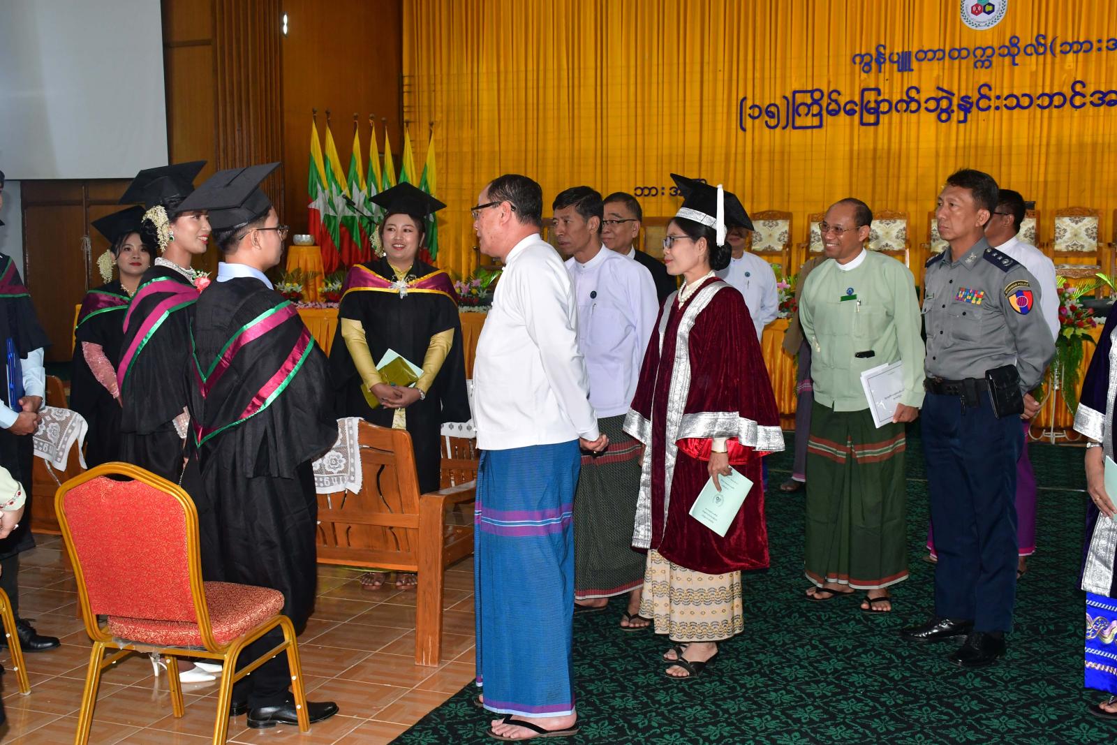 ဦးစွာ ပြည်နယ်ဝန်ကြီးချုပ် ဦးစောမြင့်ဦးက တိုးတက်ပြောင်းလဲလာသည့် သိပ္ပံနှင့်နည်းပညာဆိုင်ရာ စွန့်ဦးတီထွင်သူများ၊ ထိုးထွင်းကြံဆမှုနှင့်တီထွင်ဖန်တီးမှုများကို စွမ်းဆောင်နိုင်သည့်အရည်အချင်းပြည့်ဝသော လူ့စွမ်းအားအရင်းအမြစ်များဖြစ်အောင် ပြောင်းလဲတိုးတက်နေသည့်နည်းပညာရပ်များကို အမြဲမပြတ်လေ့လာဆည်းပူးရင်း ထူးချွန်ထက်မြတ်သည့် နိုင်ငံသားကောင်း၊ သမီးကောင်း IT ပညာရှင်များဖြစ်အောင် ကြိုးစားကြစေလိုကြောင်းပြောကြားပြီး ဘွဲ့ယူမောင်မယ်များအတွက် ငွေကျပ် (၅)သိန်းကို ချီးမြှင့်ပေးအပ်သည်။