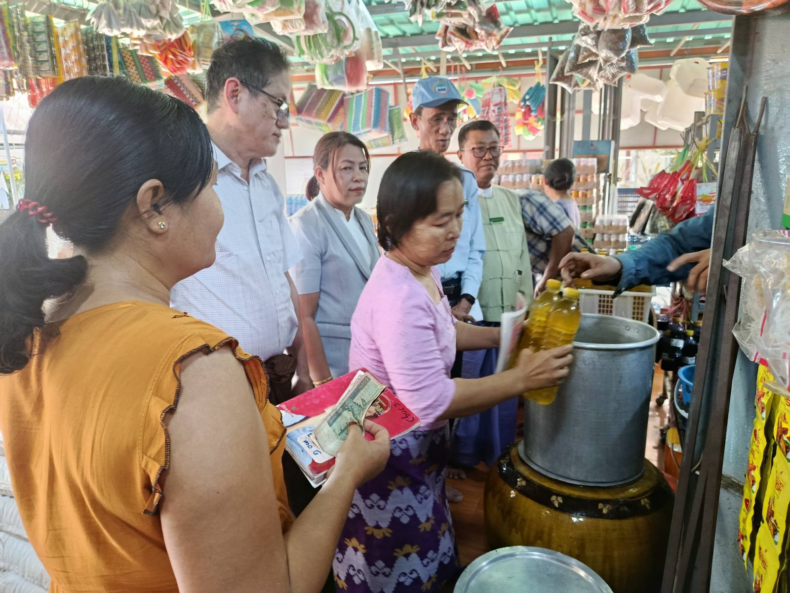 ပဲခူးတိုင်းဒေသကြီး၊ စားသုံးသူရေးရာဦးစီးဌာန၊ ပဲခူးတိုင်းဒေသကြီး၊ ဆီကုန်သည်နှင့်ဆီလုပ်ငန်းရှင်များအသင်းတို့ပူးပေါင်း၍ စီးပွားရေးနှင့်ကူးသန်းရောင်းဝယ်ရေးဝန်ကြီးဌာနမှ ချမှတ်ထားသည့် မှန်(၆)မှန်နှင့်အညီ သတ်မှတ်ရည်ညွှန်းစျေးအတိုင်း စားသုံးသူပြည်သူများ ဝယ်ယူရရှိမှု ရှိ/မရှိကို ယနေ့နံနက်ပိုင်းက ကဝမြို့နယ်ရပ်ကွက်များနှင့် သက္ကလမြို့ ဈေးအတွင်း စားအုန်းဆီရောင်းချနေမှုများအား သတ်မှတ်စျေးနှုန်း၊ အလေးချိန်၊ သတ်မှတ်ပမာဏမှန်ကန်မှုရှိမရှိ လိုက်လံကြည့်ရှုစစ်ဆေးသည်။