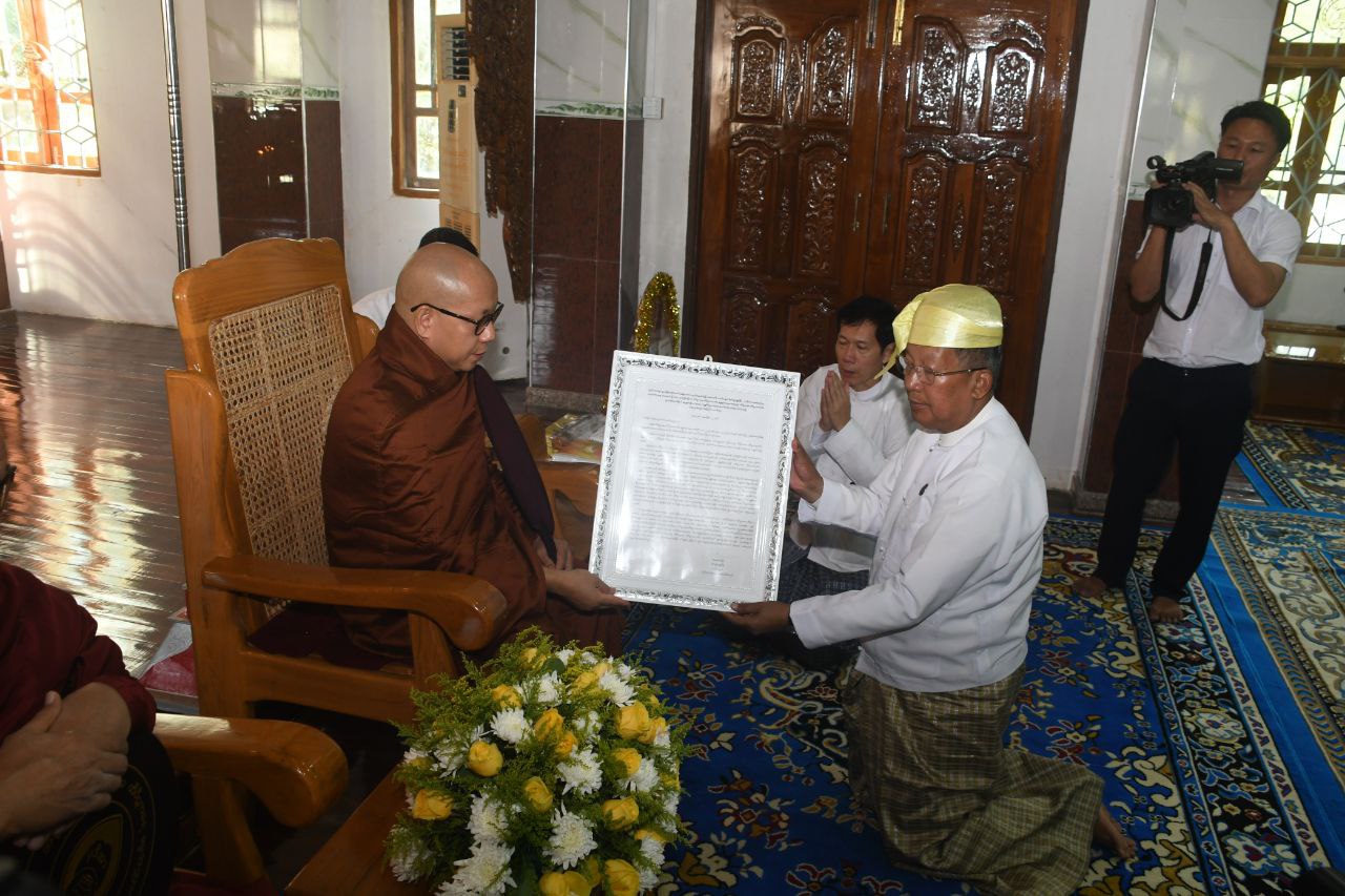 ဘွဲ့တံဆိပ်တော်ရရှိတော်မူသော ဆရာတော်ထံသို့ ပြည်ထောင်စုသမ္မတမြန်မာနိုင်ငံတော် ယာယီသမ္မတ နိုင်ငံတော်လုံခြုံရေးနှင့် အေးချမ်းသာယာရေးကော်မရှင်ဥက္ကဋ္ဌ ဗိုလ်ချုပ်မှူးကြီး မင်းအောင်လှိုင်ထံမှ ဆက်ကပ်ပေးပို့သည့် ဂုဏ်ယူဝမ်းမြောက်ကြောင်း သဝဏ်လွှာဆက်ကပ်လှူဒါန်း