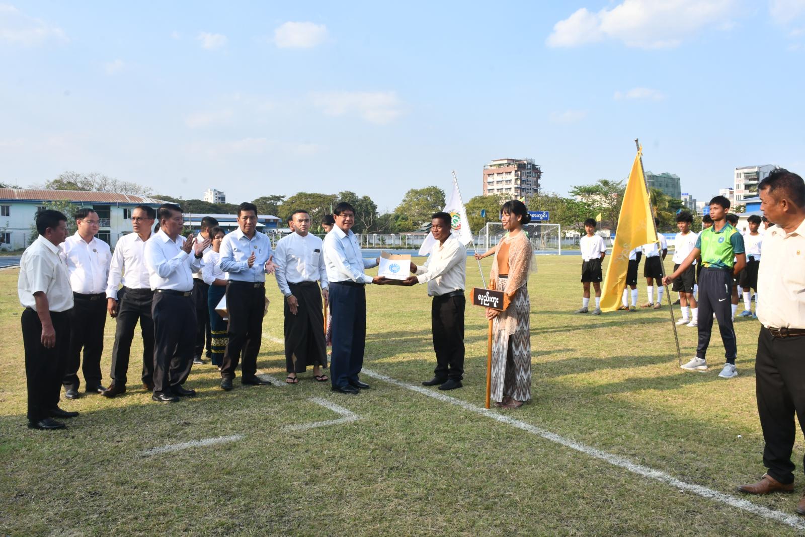 ယင်းနောက် ရန်ကုန်တိုင်းဒေသကြီး ဝန်ကြီးချုပ် ဦးစိုးသိန်းနှင့် အဖွဲ့က ပထမပွဲစဉ်အဖြစ် ဒဂုံမြို့သစ်ခရိုင်အသင်းနှင့် မရမ်းကုန်းခရိုင်အသင်းတို့၏ ယှဉ်ပြိုင်ကစားနေမှုအား ကြည့်ရှုအားပေးသည်။