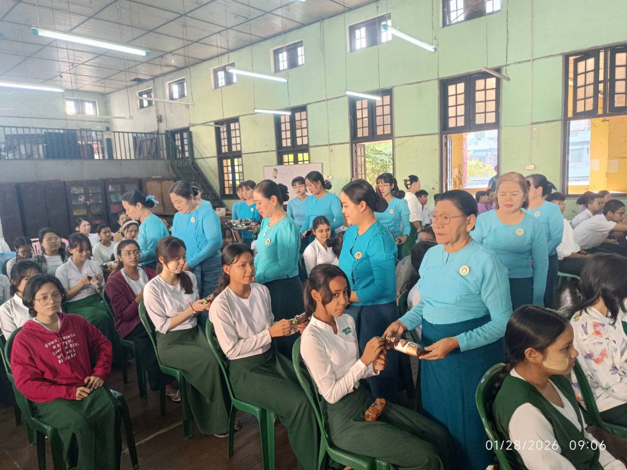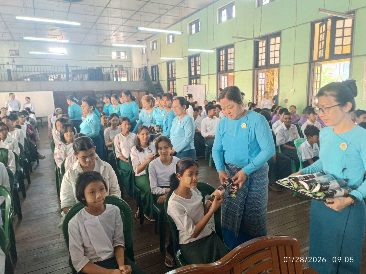 အဆိုပါအခမ်းအနားသို့ မြို့နယ်စီမံခန့်ခွဲရေးနှင့် အုပ်ချုပ်ရေးကော်မတီဥက္ကဋ္ဌ ဦးဇော်မိုးအောင်နှင့် အဖွဲ့ဝင်များ၊ မြို့နယ်အမျိုးသမီးရေးရာအဖွဲ့ဥက္ကဋ္ဌ ဒေါ်နှင်းနှင်းအေးနှင့် အဖွဲ့ဝင်များ၊ မြို့နယ်မိခင်နှင့် ကလေးစောင့်ရှောက်ရေးအသင်းဝင်များ၊ တာဝန်ခံမြို့နယ်ပညာရေးမှူး ဦးခင်စိုး၊ ကျောင်းအုပ်ဆရာ မကြီးဒေါ်ခင်ထားနွယ်နှင့် ဆရာမများ၊ ကျောင်းသား/ကျောင်းသူများ တက်ရောက်ခဲ့ကြပြီး အခမ်းအနားတက်ရောက်လာသူများအား မြို့နယ်အမျိုးသမီးရေးရာအဖွဲ့ဥက္ကဋ္ဌ ဒေါ်နှင်းနှင်းအေးနှင့်အဖွဲ့ဝင်များ၊ မြို့နယ်မိခင်နှင့် ကလေးစောင့်ရှောက်ရေးအသင်းဝင်များက အာဟာရမုန့်များ ဝေငှပေးခဲ့ကြောင်း သိရသည်။