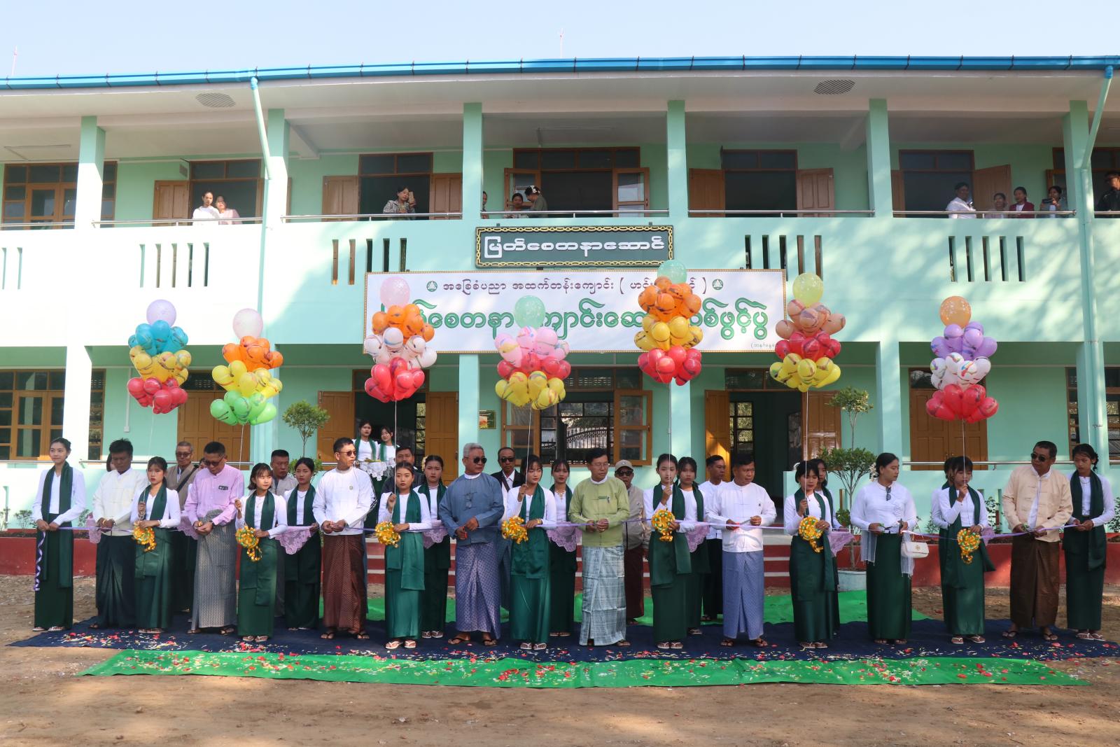 ရှေးဦးစွာ မြို့နယ်စီမံခန့်ခွဲရေးနှင့်အုပ်ချုပ်ရေးကော်မတီဥက္ကဋ္ဌ ဦးမျိုးသက်ကျော်နှင့် ကော်မတီဝင်များ၊ မြို့နယ်ပညာရေးမှူးဦးလှထွန်းနှင့်တာဝန်ရှိသူများ၊ ကျောင်းအုပ်ဆရာမကြီး ဒေါ်လှမြတ်သူနှင့် ကျေးရွာအုပ်စုအုပ်ချုပ်ရေးမှူးတို့က ကျောင်းဆောင်သစ်အားဖဲကြိုးဖြတ် ဖွင့်လှစ်ပေးပြီး ကဗ္ဗည်းကျောက်စာအား အမွှေးနံ့သာရည်များ ပက်ဖျန်းပေးသည်။