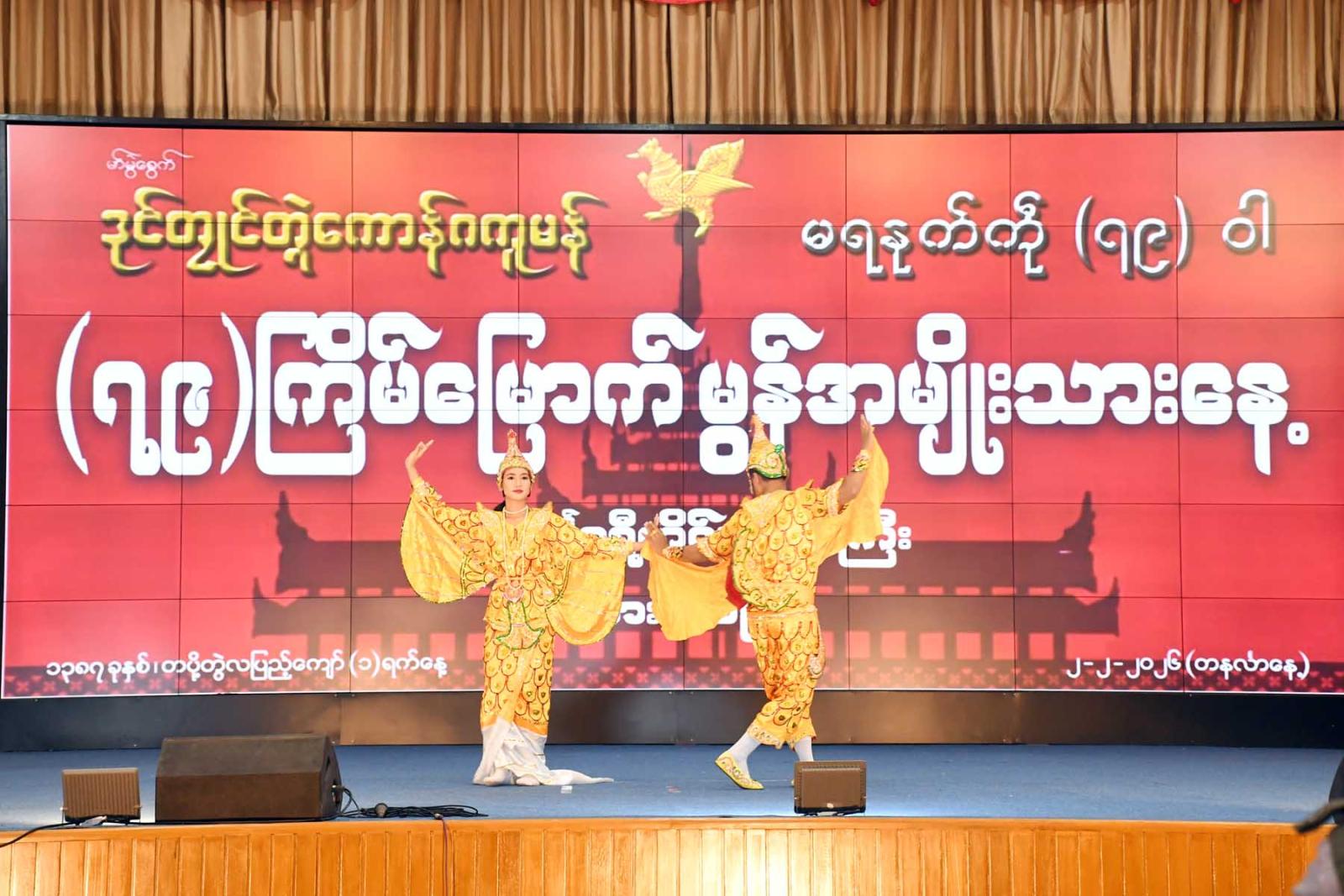 ထို့နောက်တက်ရောက်လာသောဧည့်သည်တော်များအား မွန်ရိုးရာတပင်တိုင်အကဖြင့် ကပြဖျော်ဖြေတင်ဆက်ပြီး နယ်စပ်ရေးရာဝန်ကြီးဌာနနှင့် တိုင်းရင်းသားလူမျိုးများရေးရာဝန်ကြီးဌာန ပြည်ထောင်စုဝန်ကြီး ဒုတိယဗိုလ်ချုပ်ကြီးရာပြည့်ကပေးပို့သည့် မွန်အမျိုးသားနေ့ သဝဏ်လွှာအား တိုင်းဒေသကြီးတိုင်းရင်းသားရေးရာဝန်ကြီး ဦးစောမာတင်လူသာက ဖတ်ကြားသည်။