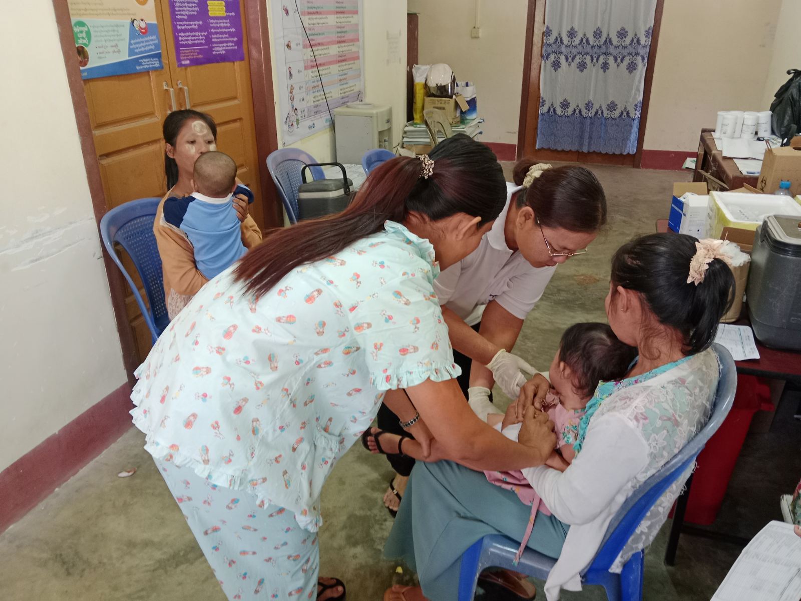 အဆိုပါကာကွယ်ဆေးထိုးနှံခြင်းလုပ်ငန်းကို မြို့နယ်ပြည်သူ့ကျန်းမာရေးဦးစီးဌာနမှူး ဒေါက်တာဝင်းဇော်ဦးကြီးကြပ်မှုဖြင့် ကျန်းမာရေးဝန်ထမ်းများက ကလေးသူငယ်များအား ကိုယ်အပူချိန်တိုင်းခြင်း၊ ပေါင်ချိန်ခြင်း၊ စာရင်းရေးသွင်းခြင်း တို့ကိုဆောင်ရွက်ပေးခဲ့ပြီး မွေးကင်းစမှ အသက်(၂)နှစ်အောက်ကလေးသူငယ်များကို ဆုံဆို့ကြက်ညှာချောင်းဆိုး၊ အသည်းရောင်အသားအဝါ(ဘီ)၊ ဘီစီဂျီ၊ ပိုလီယို၊ ဦးနှောက်အမြှေးရောင်ရောဂါစသည့် (ငါးမျိုးစပ် ကာကွယ်ဆေး)ပိုလီယိုကာကွယ်ဆေး၊ ပြင်းထန်းအဆုတ်ရောင်(ပီစီဗီ)၊ ဝက်သက်-ဂျိုက်သိုးစသည့် ကာကွယ်ဆေးများကို အသက်အရွယ်အလိုက်သတ်မှတ်အကြိမ်တိုင်း ထိုးနှံပေးခြင်း၊ ပိုလီယိုအစက်ချဆေးတိုက်ကျွေးခြင်း၊ ကာကွယ်ဆေးထိုးနှံပေးခြင်းနှင့် ဗီတာဗင်-A အားဆေးတိုက်ကျွေးခြင်းတို့ကို ဆောင်ရွက်ပေးသည်။