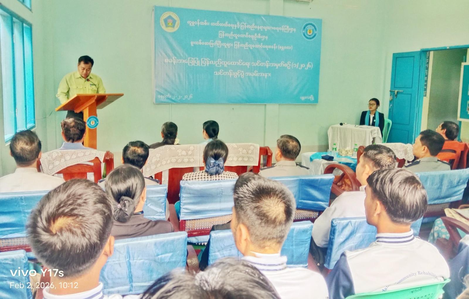 လူမှုဝန်ထမ်း၊ ကယ်ဆယ်ရေးနှင့်ပြန်လည်နေရာချထားရေးဝန်ကြီးဌာန ပြန်လည်ထူထောင်ရေးဦးစီးဌာန မူးယစ်ဆေးဖြတ်ပြီးသူများပြန်လည်ထူထောင်ရေးစခန်းက ကြီးမှူးဖွင့်လှစ်သော စခန်းအခြေပြုပြန်လည်ထူထောင်ရေးသင်တန်းအမှတ်စဉ်(၁/၂၀၂၆) သင်တန်းဖွင့်ပွဲအခမ်းအနားကို ဖေဖော်ဝါရီ ၂ ရက် နံနက် ၁၀နာရီက အောင်မြေသာစံမြို့နယ်၊ ဥပုသ်တော်ရပ်ကွက် ၇၃လမ်း၊ ၁၁×၁၂လမ်းကြားရှိ မူးယစ်ဆေးဖြတ်ပြီးသူများ ပြန်လည်ထူထောင်ရေးစခန်း၌ ကျင်းပသည်။