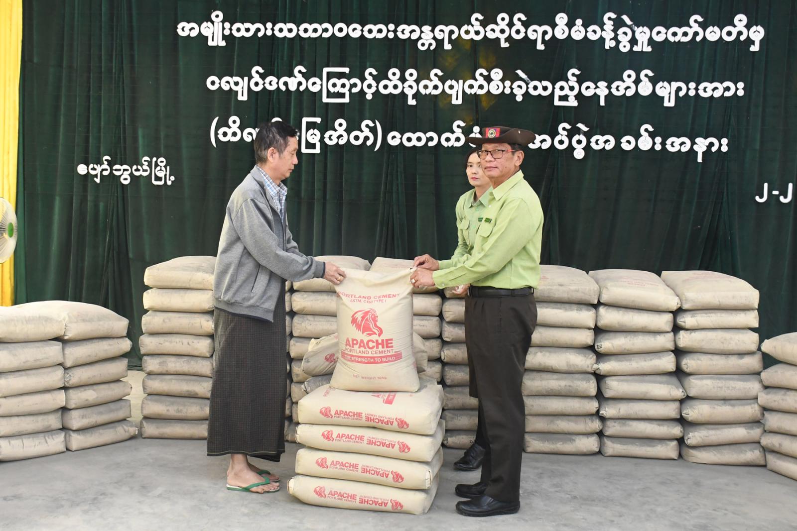 အမျိုးသားသဘာဝဘေးအန္တရာယ်ဆိုင်ရာစီမံခန့်ခွဲမှုကော်မတီမှ မြို့ပေါ်ရပ်ကွက် ၇ ရပ်ကွက်နှင့် ကျေးရွာအုပ်စု ၅ အုပ်စုမှ နေအိမ်အလုံးစုံပျက်စီးမှု ၁၅၆ လုံးအတွက် ဘိလပ်မြေအိတ် ၄၂၀၀၀ ကျော်ကိုပေးအပ်ခဲ့ရာ ခရိုင်စီမံခန့်ခွဲရေးနှင့်အုပ်ချုပ်ရေးကော်မတီဥက္ကဋ္ဌ ဦးစိန်မြင့်နှင့်တာဝန်ရှိသူများက ပြည်သူများထံ ထပ်ဆင့်ပေးအပ်ခဲ့ကြောင်းသိရသည်။