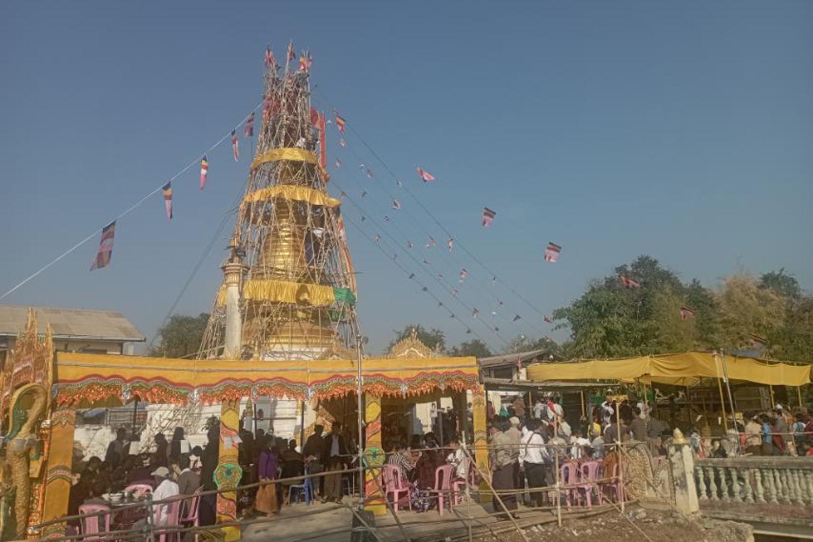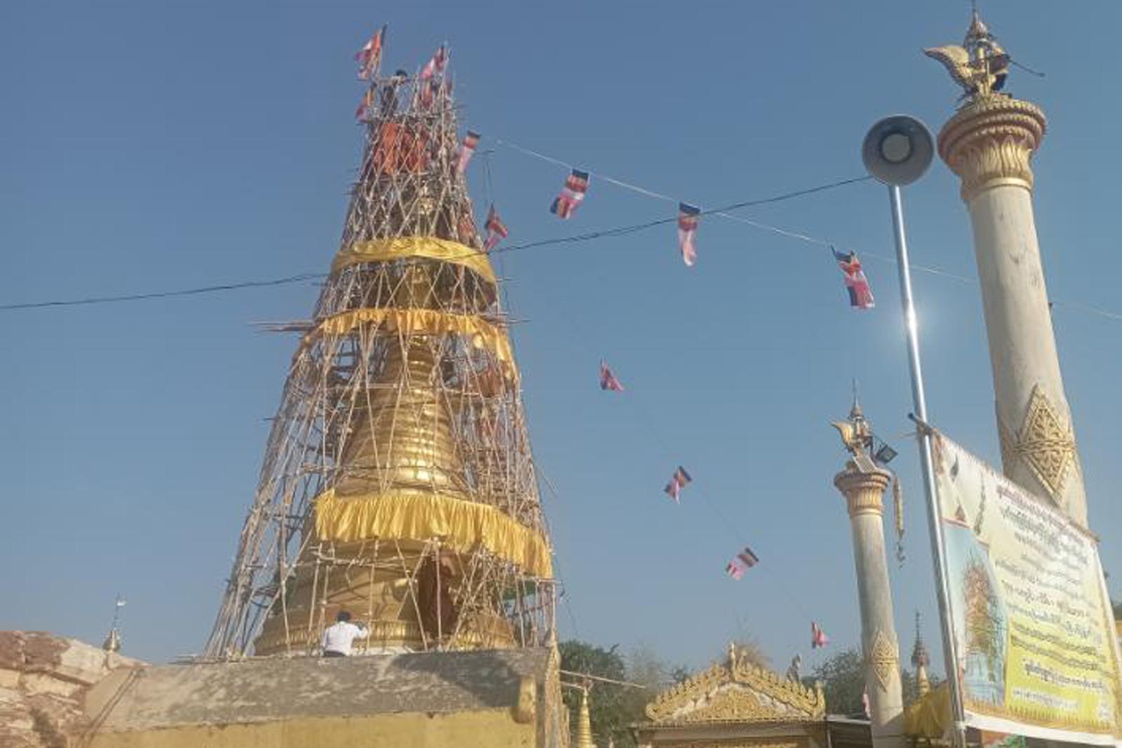 မန္တလေးတိုင်းဒေသကြီး၊ ပျော်ဘွယ်မြို့၊ မြင်းဘက်ရပ်ကွက်၌ မန္တလေးမြေငလျင်ကြောင့် ထိခိုက်မှုဖြစ်ပွားခဲ့သော ရွှေစေတီတော်ကြီးအား ဘက်စုံမွမ်းမံပြုပြင်ခြင်းနှင့် ထီးတော်သစ်တင်လှူပူဇော်ခြင်းမင်္ဂလာကို ဖေဖော်ဝါရီလ ၅ ရက် နံနက် ၈ နာရီခန့်က အဆိုပါစေတီတော်တွင် ကျင်းပခဲ့ကြောင်းသိရသည်။