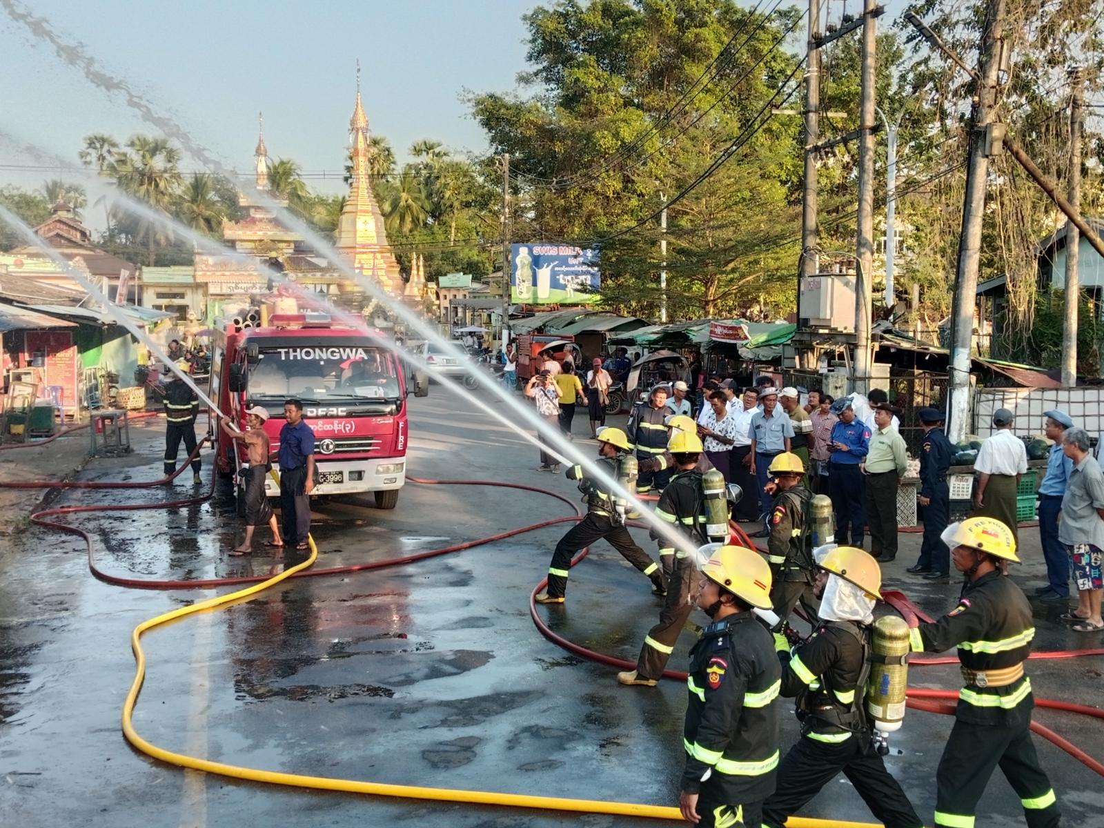 မီးငြိမ်းသတ်ခြင်း သရုပ်ပြဇတ်တိုက်လေ့ကျင့်ခြင်း ပြုလုပ်ရာသို့ မြို့နယ်စီမံခန့်ခွဲရေးနှင့် အုပ်ချုပ်ရေးကော်မတီဥက္ကဋ္ဌ ဦးဇော်မျိုးဝင်းနှင့် အဖွဲ့ဝင်များ၊ မြို့နယ်မီးသတ်ဦးစီးအရာရှိ ဦးတင်မျိုးလွင်နှင့် မီးသတ်တပ်ဖွဲ့ဝင်များ၊ မြို့နယ်စည်ပင်သာယာရေးအဖွဲ့အမှုဆောင်အရာရှိ ဦးကျော်စိုးမိုး၊ စျေးအကျိုးတော်ဆောင်အဖွဲ့နှင့် စျေးသူ စျေးသားများ တက်ရောက်ခဲ့ကြကြောင်း သိရသည်။