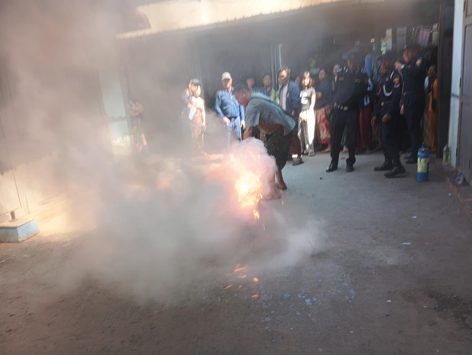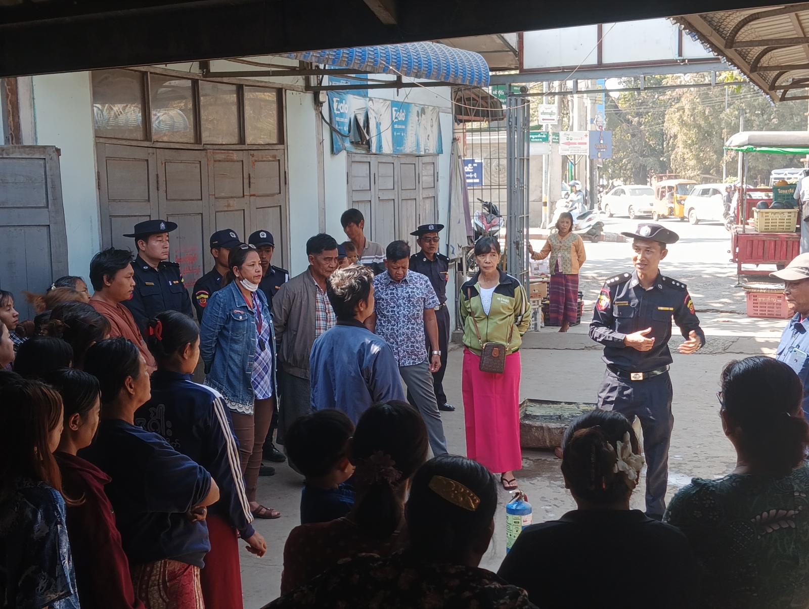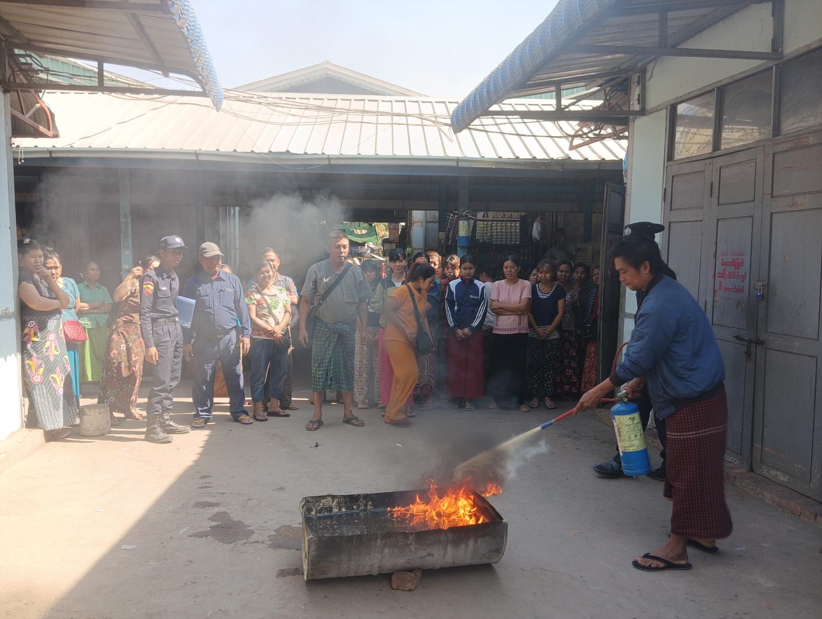 ဦးစွာ အမရပူရမြို့နယ် မီးသတ်ဦးစီးမှူး ဦးအောင်မျိုးထက်နှင့်သန္ဓေတပ်ဖွဲ့ဝင်များ၊ စျေးတာဝန်ရှိသူများက စျေးအတွင်းလှည့်လည်ကြည့်ရှုပြီး မလိုအပ်သော ပစ္စည်းများနှင့်မိုးကာများ စနစ်တကျ ထားသိုနိုင်ရေးတို့ကို စျေးတာဝန်ခံများအားမှာကြားခဲ့သည်။ ထို့နောက် စျေးသူစျေးသားများနှင့် စျေးတာဝန်ရှိသူများအား မီးဘေးနှင့်ပတ်သက်သည့်ဗဟုသုတများ၊ မီးသတ်ဆေးဘူးသုံးစွဲနည်းများကို ပြောကြားခဲ့သည်။ ဆက်လက်ပြီး လက်တွေ့မီးငြှိမ်းသတ်ခြင်းကို စျေးသူစျေးသားများ ကိုယ်တိုင်လုပ်ဆောင်စေခဲ့ပြီး မီးဘေးကြိုတင်ကာကွယ်ရေး လက်တွေ့သရုပ်ပြမှုကို ဆောင်ရွက်ခဲ့ကြောင်းသိရသည်။