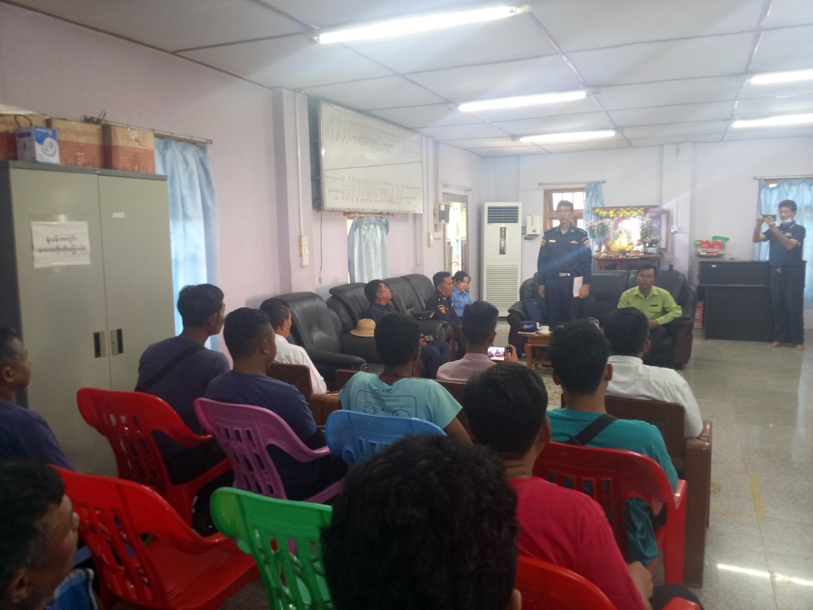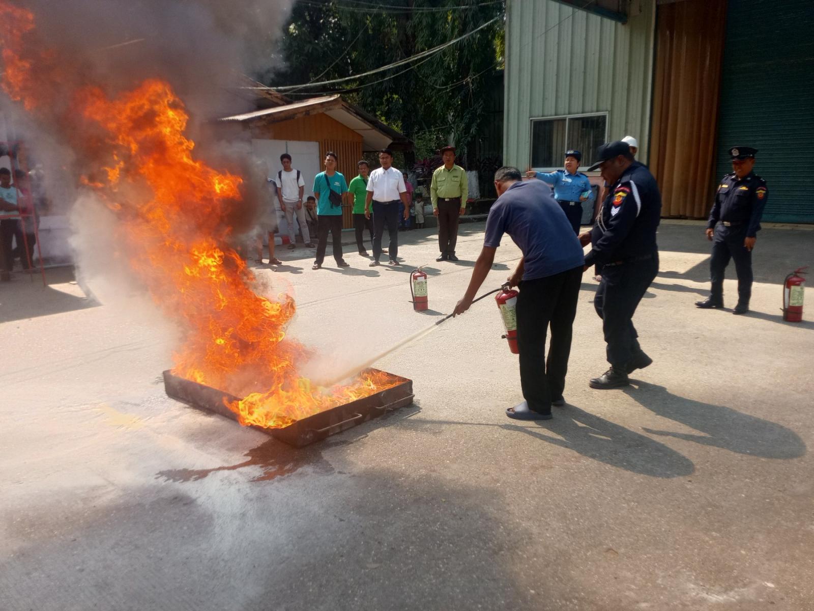 ယင်းနောက် မြို့နယ်မီးသတ်ဦးစီးဌာနမှ စက်ရုံဝန်ထမ်းများအား မီးဘေးအန္တရာယ်ကြုံတွေ့လာပါက လွယ်ကူလျင်မြန်စွာ အရေးပေါ်မီးငြိမ်းသတ်နိုင်ရေးအတွက် မီးသတ်ဆေးဘူး၊ ရေတို့ဖြင့် မီးငြိမ်းသတ်ခြင်းအား လက်တွေ့သရုပ်ပြဇာတ်တိုက် လေ့ကျင့်ဆောင်ရွက်ပေးခဲ့ကြောင်း သိရသည်။