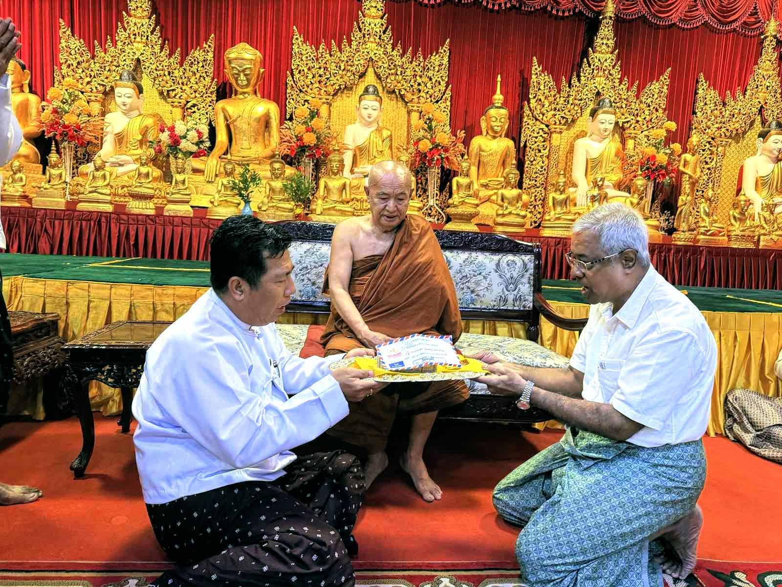 ထို့နောက် ရန်ကုန်တိုင်းဒေသကြီး သံဃနာယကအဖွဲ့ဥက္ကဋ္ဌ၊ ဒွိပိဋကဓရ၊ အဂ္ဂမဟာပဏ္ဍိတ၊ အဂ္ဂမဟာသဒ္ဓမ္မဇောတိကဓဇ ဒေါက်တာဘဒ္ဒန္တ အဂ္ဂသာမိထံမှ ငါးပါးသီလခံယူဆောက်တည်ခဲ့ပြီး ဆရာတော်က သြဝါဒကထာမြွက်ကြားကာလှူဒါန်းမှုအစုစုတို့အတွက် ရေစက်သွန်းချ အမျှပေးဝေခဲ့ကြသည်။
