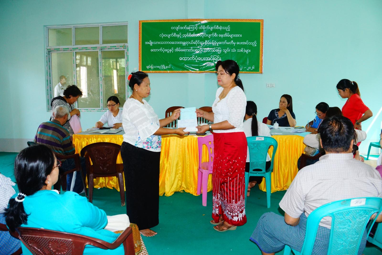 ၂၀၂၅ ခုနှစ် မတ်လ ၂၈ ရက်နေ့တွင် လှုပ်ခတ်ခဲ့သော ငလျင်ဒဏ်ကြောင့် ထိခိုက်ပျက်စီးခဲ့သည့် နေအိမ်ပိုင်ရှင်များအား အမျိုးသားသဘာဝဘေးအန္တရာယ်ဆိုင်ရာစီမံခန့်ခွဲမှုကော်မတီမှတာဝန်ရှိသူများက မြေပိုင်ဆိုင်မှုအထောက်အထားများ၊ နိုင်ငံသားမှတ်ပုံတင်စိစစ်ရေးကတ်ပြားများ၊ အိမ်ထောင်စုဇယားများနှင့် နေအိမ်ပျက်စီးမှုမှတ်တမ်းဓာတ်ပုံများစသည်တို့ကို စနစ်တကျ တိုက်ဆိုင်စစ်ဆေး၍ နေအိမ်တစ်စိတ်တစ်ပိုင်းပျက်စီးမှု၊ အလုံးစုံပျက်စီးမှုတို့အတွက် နိုင်ငံတော်မှသတ်မှတ်ထားသည့် နှုန်းထားအတိုင်း ငွေနှင့် အိမ်ဆောက်ပစ္စည်းများ ပေးအပ်သည်။