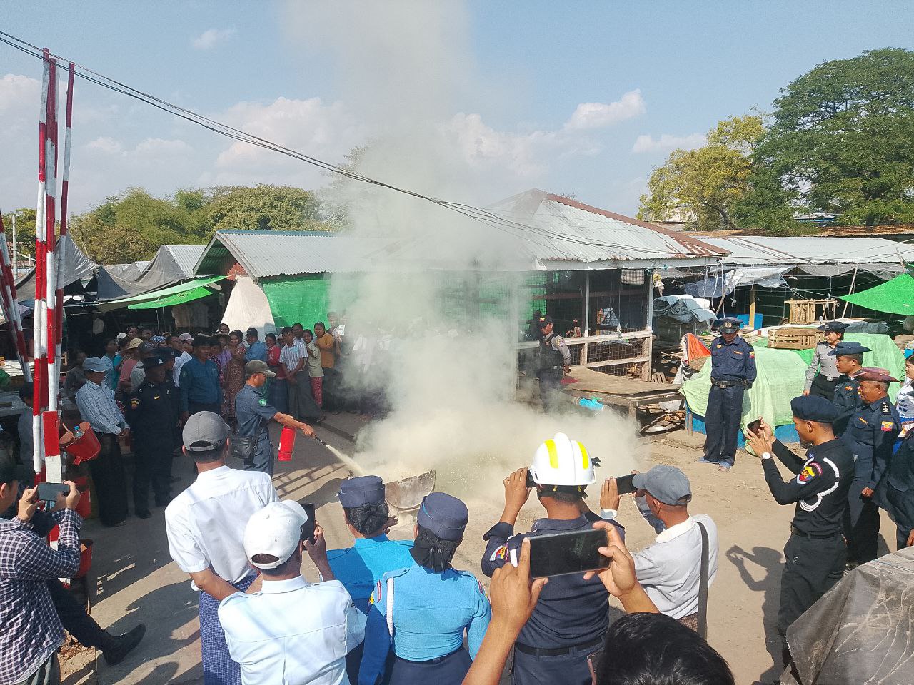 ဦးစွာ မြို့နယ်မီးသတ်ဦးစီးမှူး ဦးကျော်မျိုးက ဈေးအတွင်း မီးဘေးအန္တရာယ်မဖြစ်ပေါ်စေရေးအတွက် ဈေးသူ ဈေးသားများ စည်းကမ်းတကျလိုက်နာရေးတို့ကို ဆွေးနွေးပြီး မီးသတ်တပ်ဖွဲ့ဝင်များက မီးသတ်ဆေးဗူးအသုံးပြု၍ မီးငြိမ်းသတ်နည်းများကို ရှင်းလင်းပြောကြားကာ ဈေးသူ၊ ဈေးသားများအား လက်တွေ့မီးငြိမ်းသတ်ခြင်းကို လေ့ကျင့် သရုပ်ပြသကြသည်။