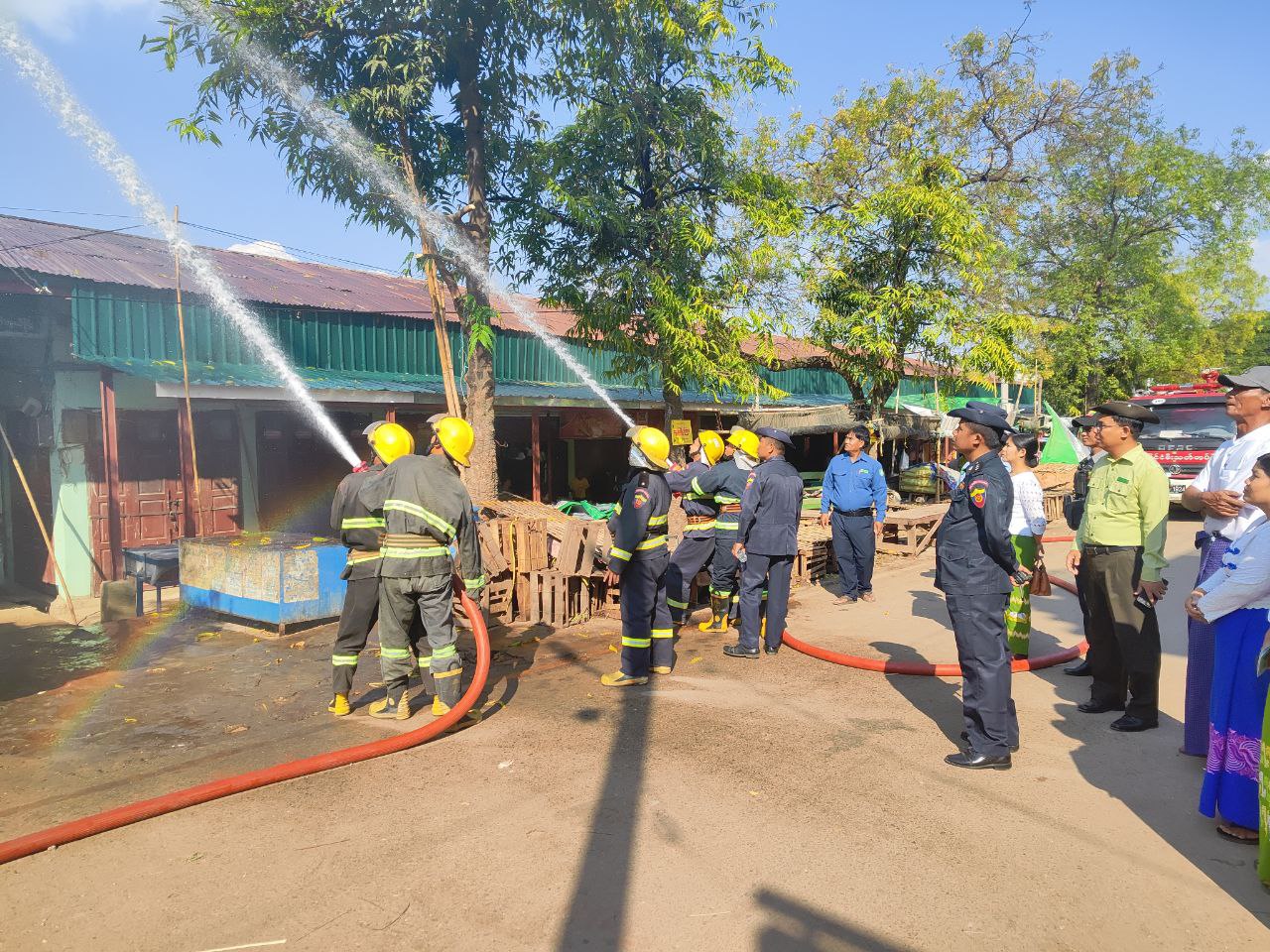 ဆက်လက်၍ မြို့နယ်စီမံခန့်ခွဲရေးနှင့်အုပ်ချုပ်ရေးကော်မတီဥက္ကဋ္ဌ ဦးအာကာစိုးနှင့်အဖွဲ့ဝင်များ၊ ရမည်းသင်းခရိုင်မီးသတ်ဦးစီးမှူး ဦးအောင်ခင်ဆင့်၊ မြို့နယ်စည်ပင်သာယာရေးအဖွဲ့မှတာဝန်ရှိသူများနှင့် ဌာနဆိုင်ရာများက မီးသတ်တပ်ဖွဲ့ဝင်များ မီးငြိမ်းသတ်ယာဉ်အသုံးပြု၍ သရုပ်ပြလေ့ကျင့်ခြင်းကိုလည်းကောင်း၊ Rescue Tool များ အသုံးပြု၍ လူနာရှာဖွေကယ်ဆယ်ရေးလေ့ကျင့်မှုများကိုကြည့်ရှုအားပေးပြီး ဈေးအတွင်း မီးဘေးကာကွယ်ရေး အတွက် ရေသိုလှောင်ထားမှု၊ မီးငြိမ်းသတ်ရေးပစ္စည်းများ အသင့်ထားရှိမှုတို့ကို လိုက်လံကြည့်ရှုခဲ့ကြောင်းသိရသည်။